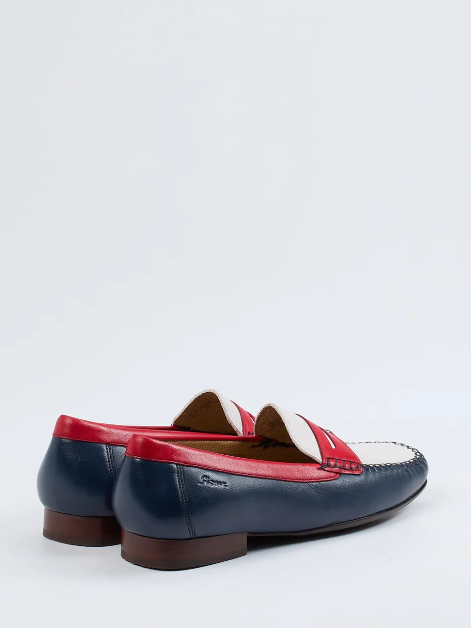 Ob beim Stadtspaziergang oder im Büro – das samtweiche Kalbleder in Marineblau, kombiniert mit Akzenten in Rot und Offwhite, hebt sich durch seine glänzende Oberfläche und kontrastierende Mokassinnaht gekonnt ab. Die klassische flache Silhouette in Schlupfform bietet durch Gummisohle und gepolstertes Fußbett angenehmen Tragekomfort. Design-Details wie der eingefasste Penny-Riemen, farblich abgesetzte Nähte und Heritage-Elemente greifen aktuelle Color-Blocking- und Preppy-Trends auf. Ideal zu weißen Blusen oder leichten Stoffhosen.