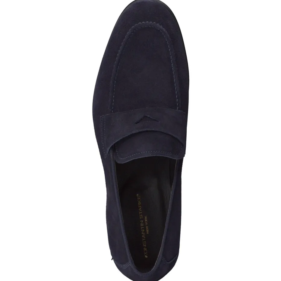 Der Herren-Slipper von Konstantin Starke ist ein klassischer Penny Loafer aus samtigem Veloursleder. Für Büro, Dinner oder Wochenend-Look bietet dieser elegant-schmale Loafer in Dunkelblau verlässlichen Stil und Komfort. Das matt strukturierte Veloursleder wird durch Ton-in-Ton-Nähte und den typischen Penny-Riegel akzentuiert. Innen sorgt fein verarbeitetes Kalbleder für ein angenehmes Tragegefühl, die Ledersohle mit rutschhemmendem Gummieinsatz unterstreicht die Hochwertigkeit. Der Look repräsentiert dezente Eleganz im Sinne des Trends „Quiet Luxury“. Ein souveräner Begleiter mit dezent maskulinem Statement – für anspruchsvolle Stilisten.