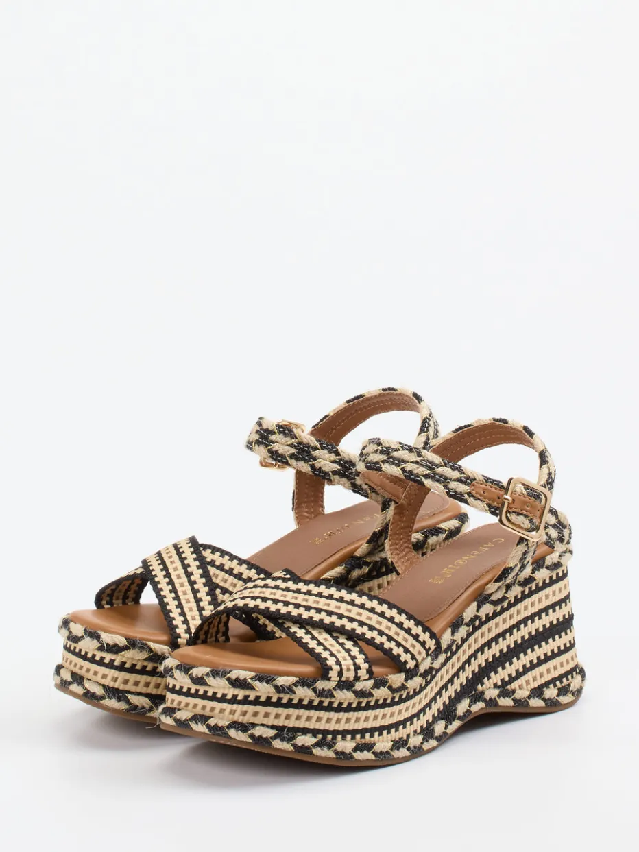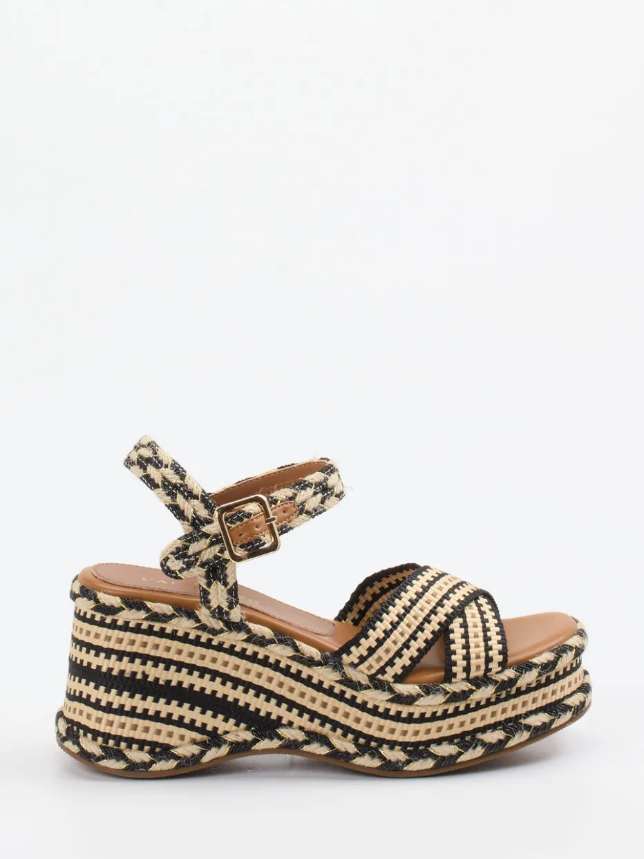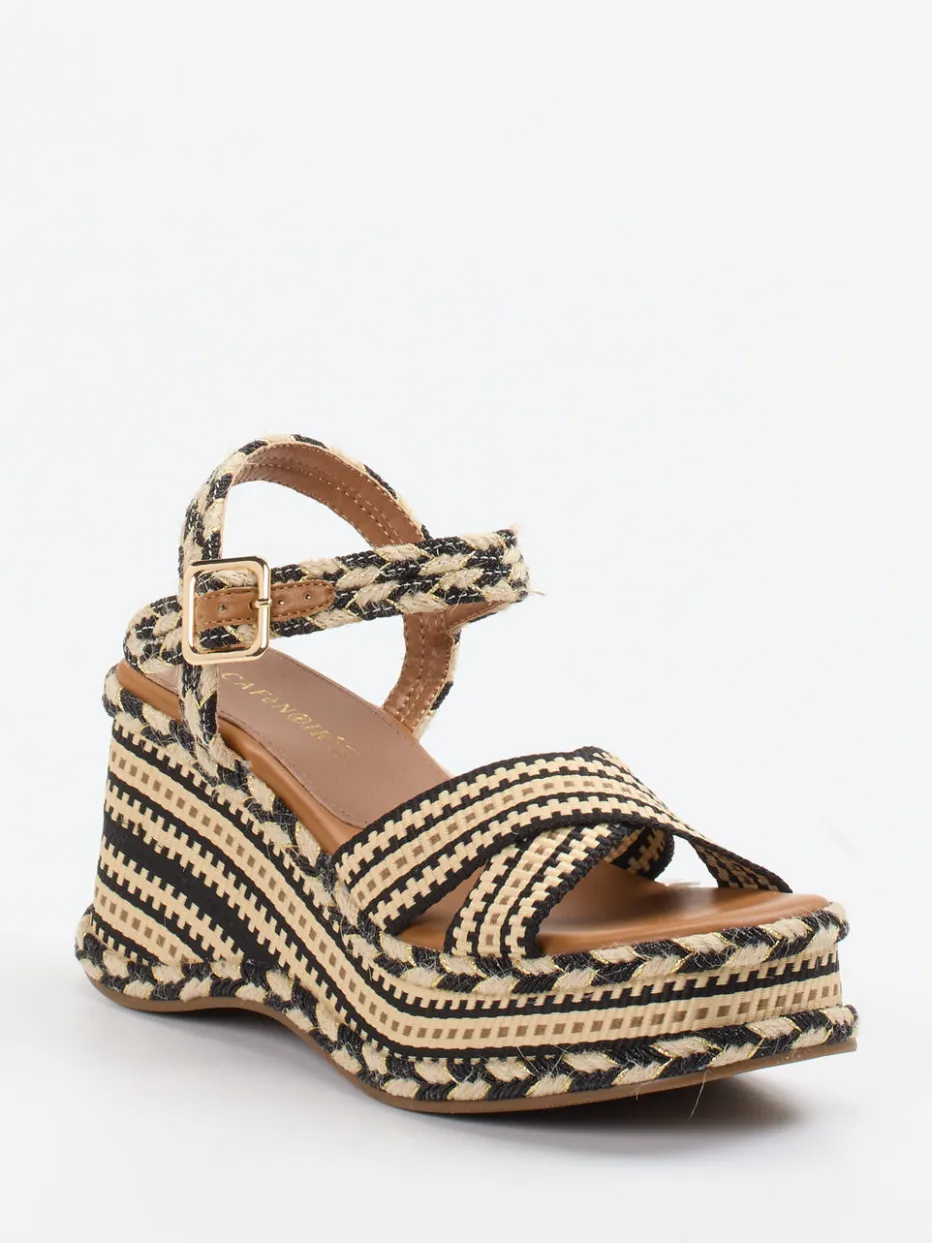 Stil-Highlight für sonnige Tage.CAFèNOIR präsentiert eine Damen-Plateausandalette im trendigen Boho-Stil. Ideal für Urlaub oder Citywalks bietet diese Sandale mit geflochtenem Textil-Obermaterial und mattem Finish sommerlichen Chic. Das überkreuzte Riemendesign und die goldfarbene Schnalle setzen stilvolle Akzente. Die gleichmäßig verlaufende Plateausohle aus rutschhemmendem Gummi sorgt für angenehme Standfestigkeit trotz 8 cm Absatzhöhe. Das schwarz-beige Design mit natürlichen Texturen passt perfekt zu luftigen Kleidern oder Bast-Accessoires. CAFèNOIR steht für feminines Design mit mediterranem Flair – trendbewusst und tragbar.