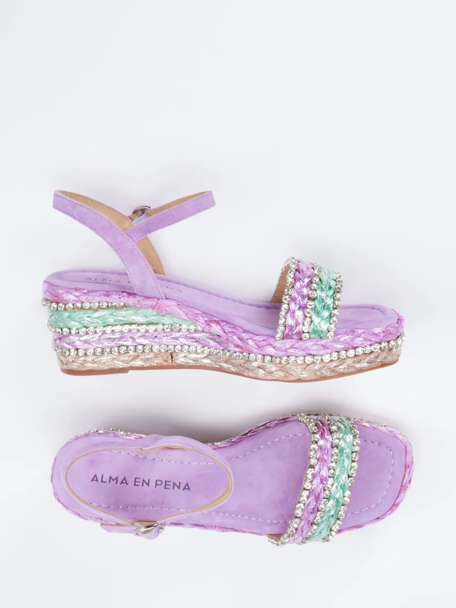 Boho-Glam für warme Nächte.Ralph Harrison präsentiert mit dieser Plateau-Sandale ein Modell, das Sommerfreude stilvoll unterstreicht. Ob Strandurlaub oder Rooftop-Abend – die weiche Velourslederbasis in mattem Flieder sorgt für angenehmen Tragekomfort, während die pastellfarbenen, bastartig geflochtenen Textilriemen ein luftig-verspieltes Flair erzeugen. Glitzernde Strasssteine entlang der Riemen und Sohlenseiten setzen glamouröse Highlights im Stil der Y2K-Ästhetik. Die plateauförmige Silhouette mit Gummisohle verbindet modische Höhe mit Alltagstauglichkeit. Der ideale Begleiter für stilbewusste Auftritte in angesagten Sommerfarben mit expressiver Note.