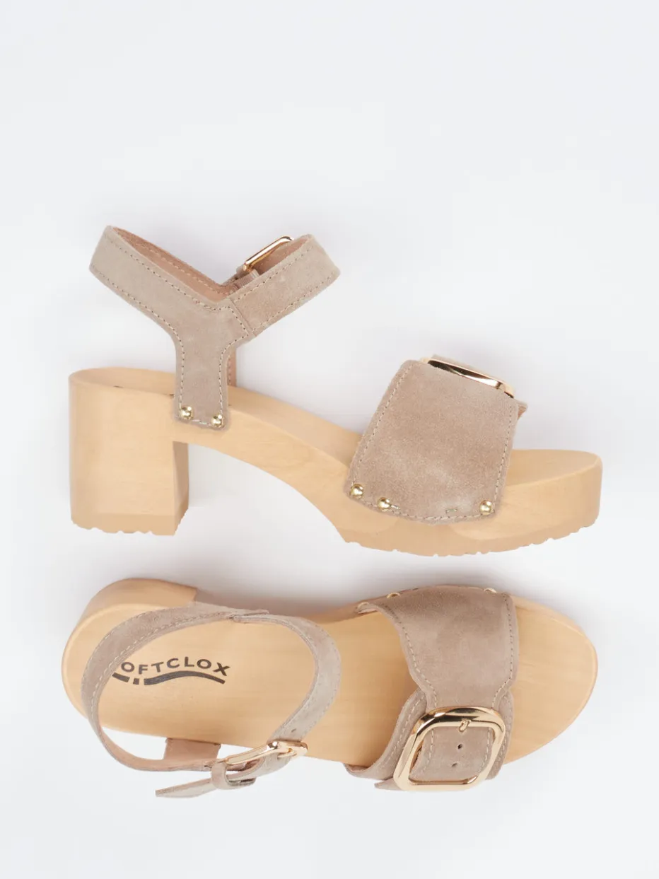 Design trifft Naturmaterialien.Die Marke Softclox präsentiert mit dieser Plateau-Sandale ein Modell für warme Tage mit modischem Anspruch. Ideal für gemütliche City-Streifzüge oder Strandspaziergänge bietet diese Sandalette mit einer Oberseite aus samtig angeschliffenem Veloursleder in Sandbeige ein angenehmes Tragegefühl. Ein komfortabler Blockabsatz und eine hochwertige, mit Elast-Element versehene Holzsohle sorgen für Stabilität und Flexibilität. Goldfarbene Schnallen und Nieten verleihen dem offenen Design im skandinavisch-minimalistischen Stil eine elegante Note. Inspiriert von den 70ern und dem Natural-Materials-Trend SS24 lässt sich das Modell vielseitig kombinieren – etwa zu Leinenkleidern oder Culottes. Softclox steht hier für durchdachten Komfort mit retro-inspiriertem Design aus natürlichen Materialien.