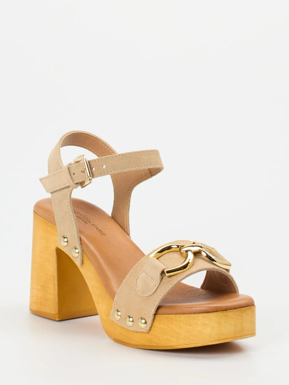 Statement-Piece mit Boho-Charakter.Konstantin Starke interpretiert die Damen-Plateau-Sandale mit einer Hommage an die 70er-Jahre. Die Kombination aus beigefarbenem Veloursleder, samtig-matter Textur und einer markanten, braunen Sohle in Holzoptik prägt den modischen Auftritt. Goldene Zierdetails wie Gliederkette und Schnalle setzen glänzende Akzente, während der breite Blockabsatz mit Plateauhöhe für Tragekomfort sorgt. Eine Dornschließe am Knöchelriemen ermöglicht den perfekten Sitz. Inspiriert von Boho-Chic und angesagten Retro-Trends lässt sich das Modell besonders gut zu luftigen Kleidern oder Paperbag-Pants kombinieren. Typisch Konstantin Starke: modisches Feingefühl trifft auf hochwertige Verarbeitung.