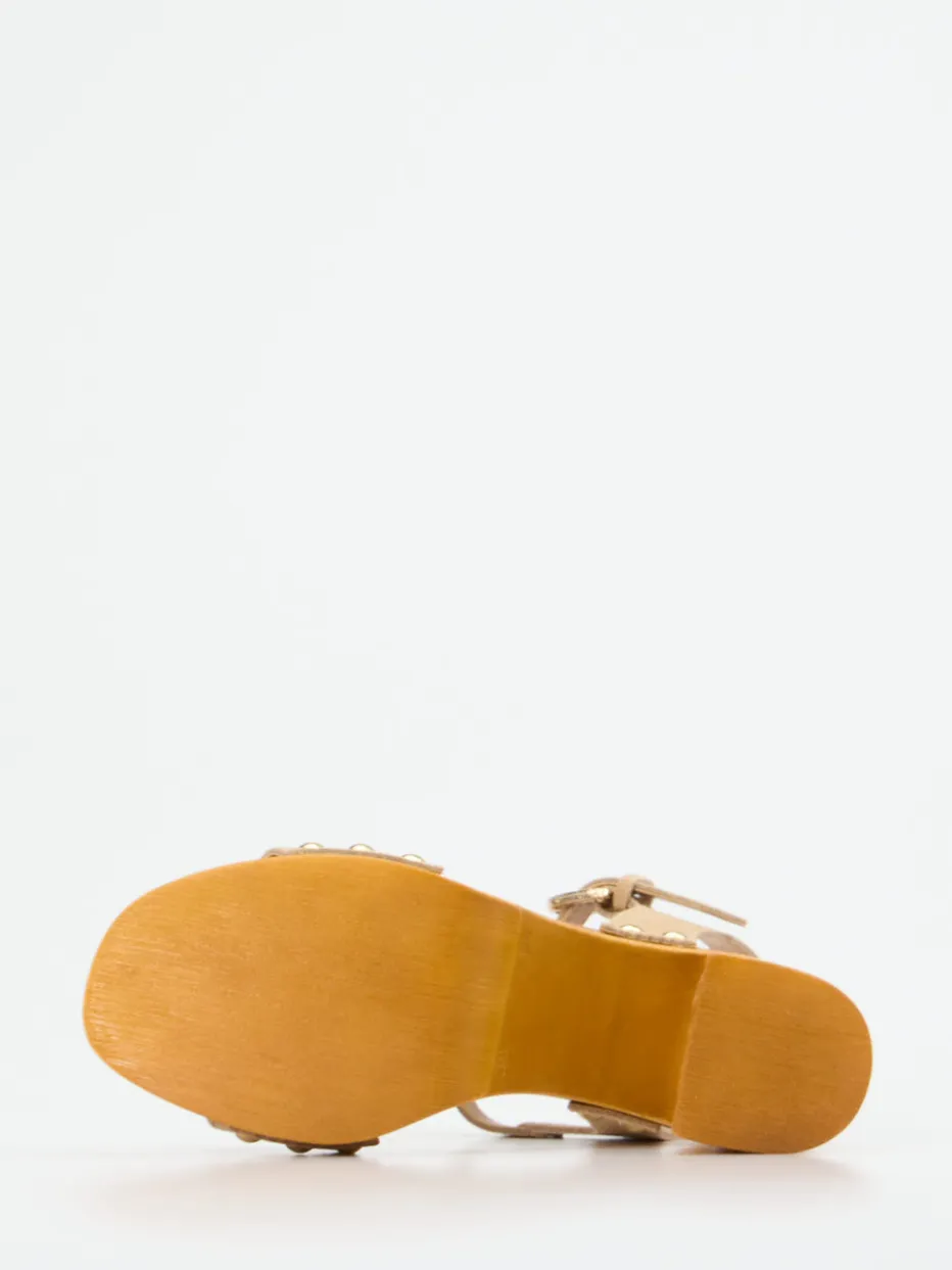 Diese Plateau-Sandalen verbinden weiches Veloursleder mit auffälliger Goldhardware und einem Retro-inspirierten Design – ideal für trendstarke Sommer-Looks.