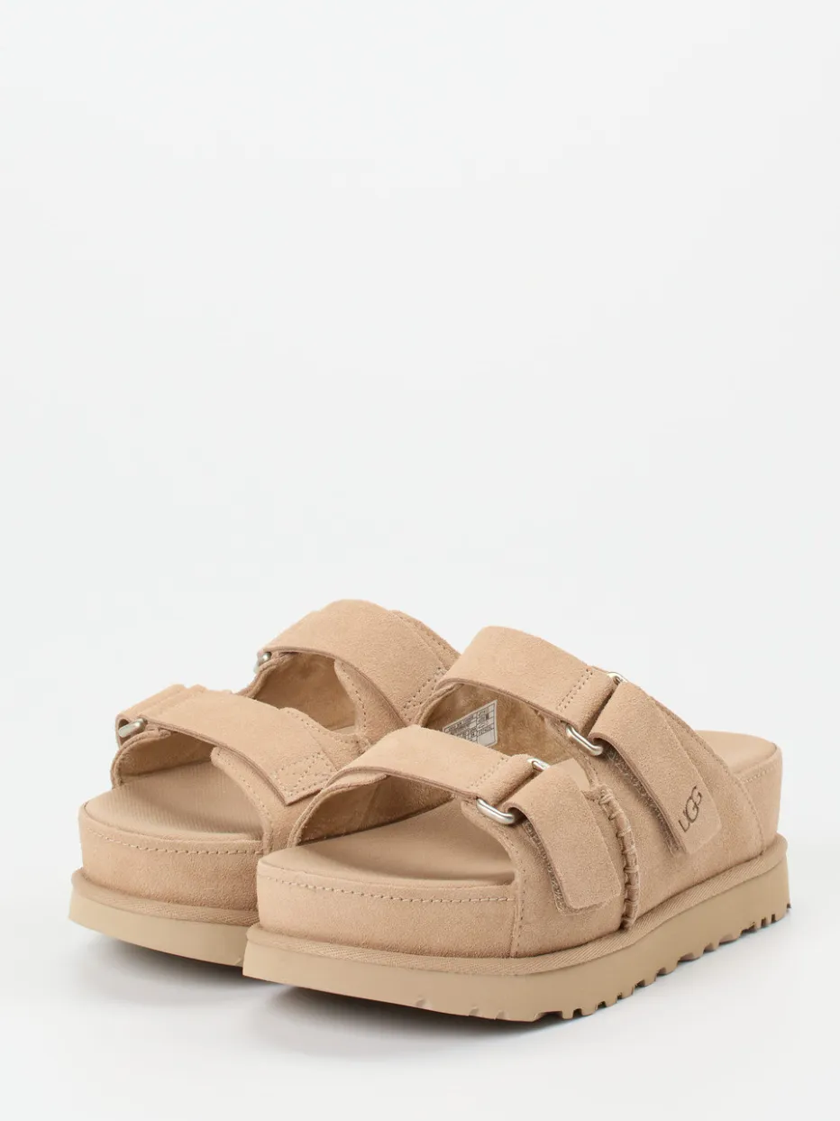 Die offene Plateau-Silhouette und das samtige Veloursleder verleihen dieser UGG-Sandale einen modernen Utility-Charakter mit sommerlichem Komfortanspruch.