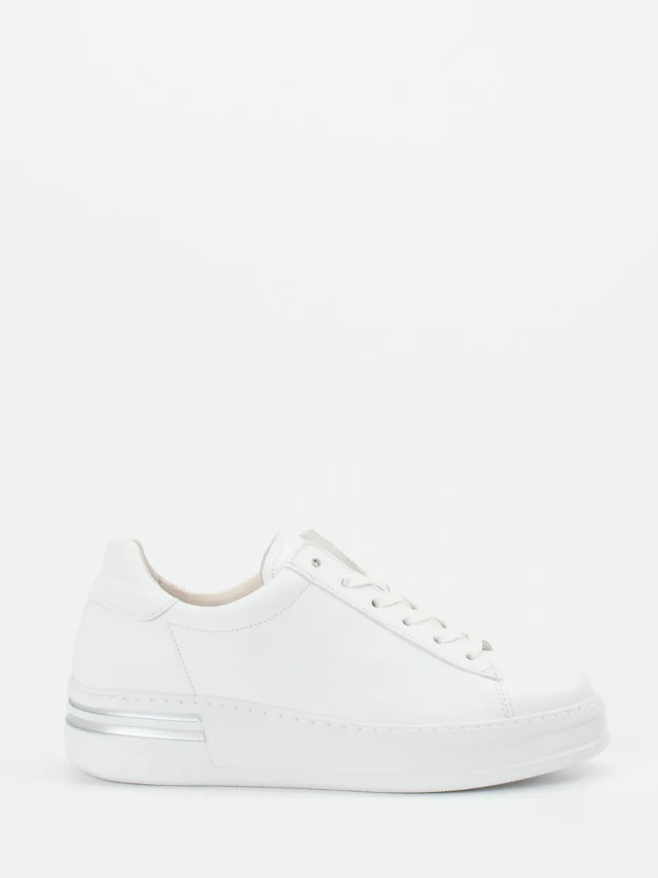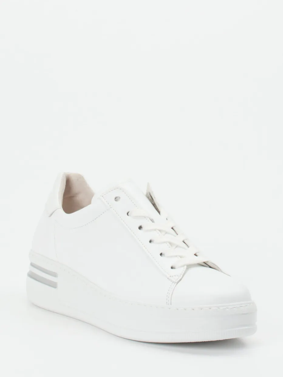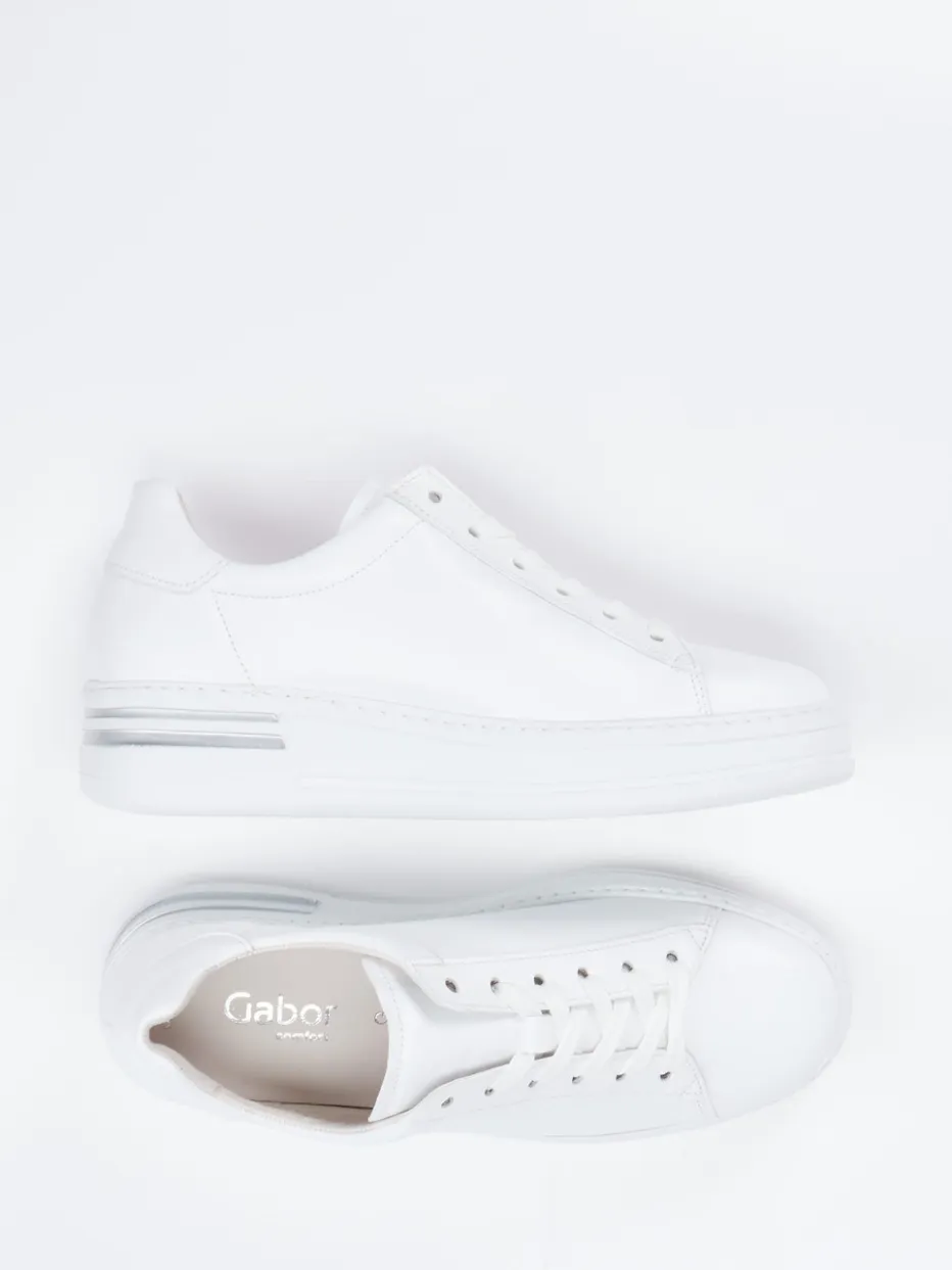 Gabor Comfort präsentiert einen Plateau-Sneaker aus hochwertigem Kalbleder mit edlem Finish.
