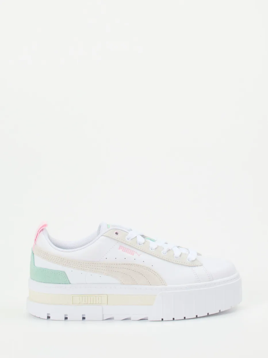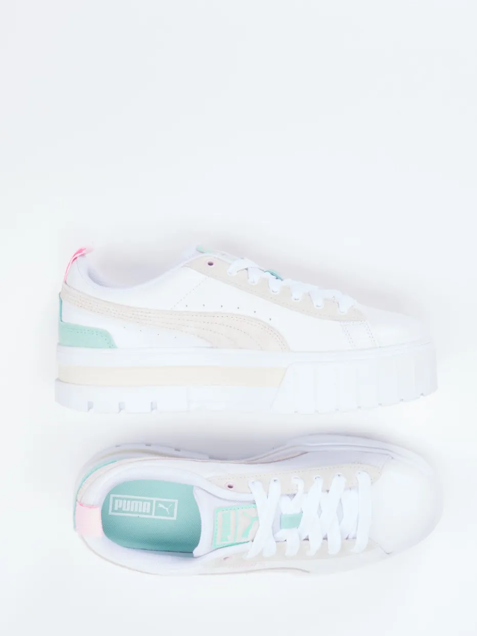 Der Mayze Mix von Puma verbindet Kalbleder mit samtigem Velours und setzt auf trendige Pastellakzente sowie eine markante Plateau-Sohle. Ausdrucksstarkes Design trifft auf modernen Tragekomfort.
