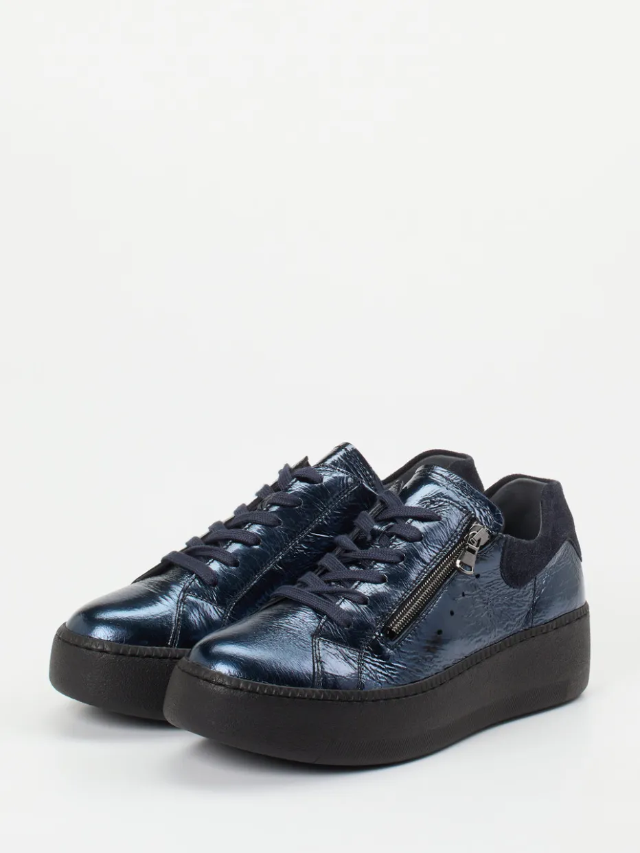 Funktion trifft auf Stilgefühl.Waldläufer bringt mit diesem Plateau-Sneaker modernes Design in bequeme Formen. Für stilbewusste Momente zwischen Alltag und Ausgehen bietet der Schuh aus schimmerndem Metallicleder in Nachtblau mit samtigen Veloursakzenten und glänzender, leicht geknitterter Oberfläche eine spannende Materialkombination. Der seitliche Schwarzchrom-Reißverschluss ergänzt die klassische Silhouette funktional und optisch. Die rutschhemmende Luftpolstersohle sorgt für angenehmes Laufgefühl, während Streetwear-Einflüsse und Metallic-Trenddetails modische Präsenz zeigen. Perfekt zu schmalen Jeans und urbanem Styling. Waldläufer überzeugt mit trendstarkem Komfort für anspruchsvolle Füße.