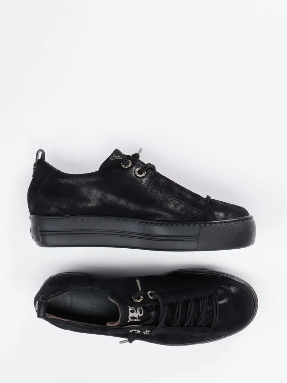 Modernes Understatement für jeden Tag.Paul Green präsentiert einen Damen-Plateau-Sneaker in monochromem Schwarz. Ideal für entspannte City-Tage verbindet das Modell samtig angeschliffenes Nubukleder mit einer flexiblen Schnürung samt Zier-Ösen. Das rund-kompakte Design sorgt mit gepolstertem Einstieg, Velourslederfutter und anatomisch geformtem Fußbett für angenehmen Tragekomfort. Eine solide Gummisohle mit leichtem Plateau unterstreicht den Streetstyle-Charakter und greift aktuelle Plattform-Trends auf. Dezente Logo-Stickereien und silberfarbene Details setzen subtile Akzente. Lässt sich ideal zu Oversized-Hoodies oder schwarzen Ledertaschen kombinieren. Bequemes Design trifft auf trendigen Minimalismus – ganz in Paul Green Manier.