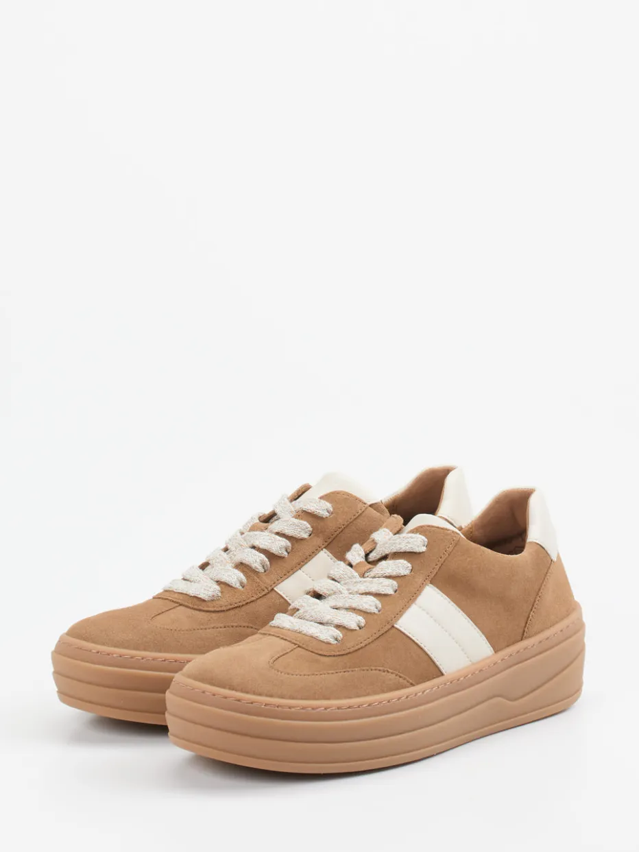 Für entspannte Alltagslooks bietet der karamellbraune Veloursleder-Sneaker mit samtiger Struktur und verstärkter Ferse optimalen Tragekomfort. Ton-in-Ton-Nähte und zweifarbige Schnürsenkel heben das reduzierte Design subtil hervor. Die rundumvernähte Gummisohle mit Plateau-Akzent verleiht dem Schuh ein modernes Chunky-Profil, unterstützt durch Polsterung und wechselbares Memory-Foam-Fußbett. Natürliche Töne und klare Linien unterstreichen den minimalistischen 90s-Charme. Ideal kombinierbar mit urbanen Casual-Outfits in Creme, Beige oder Off-White.