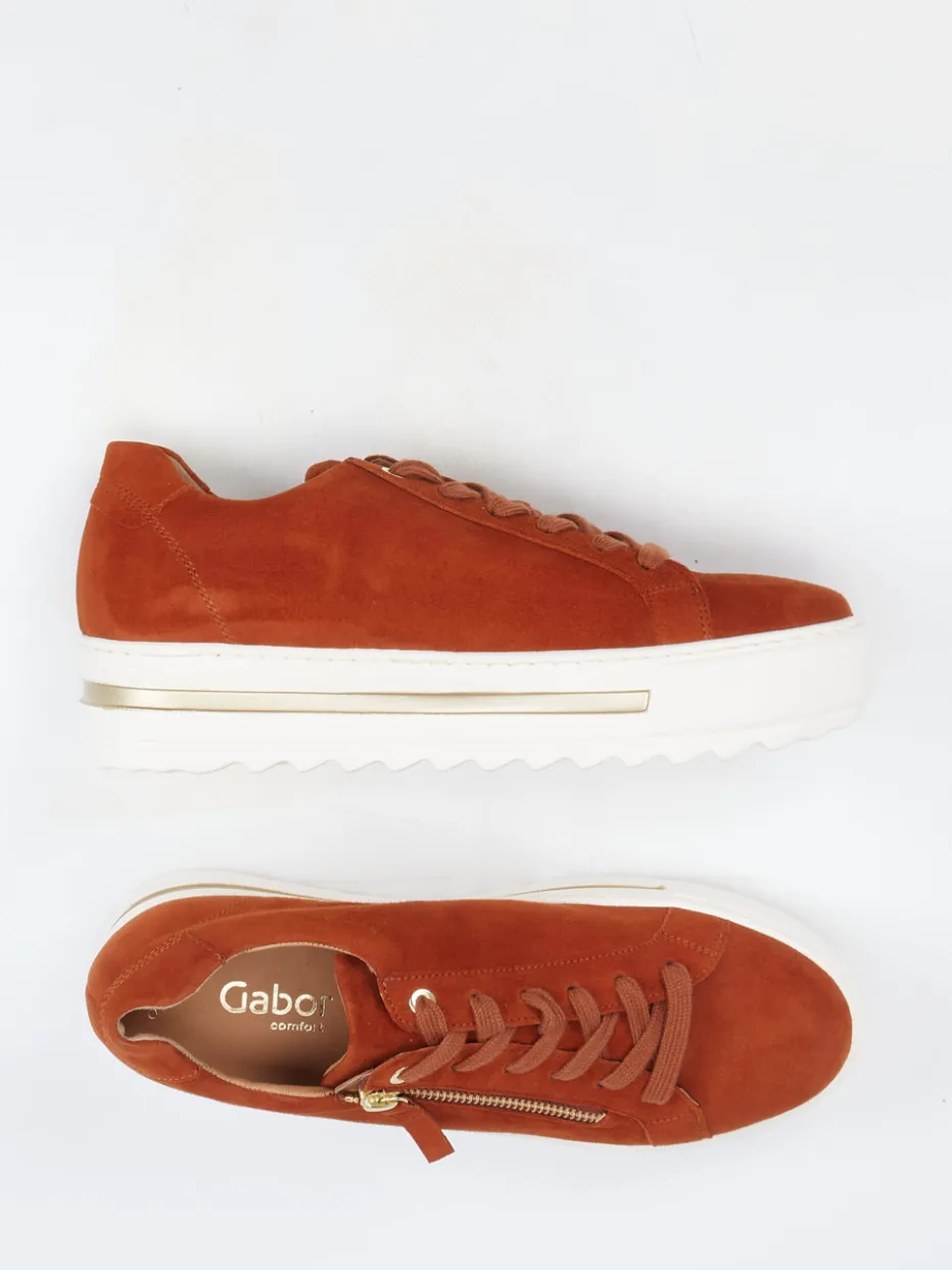 Komfort trifft auf Trenddesign.Gabor Comfort präsentiert einen stilvollen Damen-Sneaker im sportlich-eleganten Look. Für entspannte City-Tage oder Reiseabenteuer bietet das Modell zuverlässigen Komfort dank gepolsterter Innensohle und Weite G. Ziegelrotes Veloursleder, samtig angeschliffen, trifft auf eine rund-kompakte Silhouette mit goldfarbenem Reißverschluss und Metallic-Streifen in der Sohlenkante. Die strukturierte Gummisohle mit Zackenprofil sorgt für Trittsicherheit, während Streetwear-Einflüsse und metallicfarbene Details einen modernen Akzent setzen. Kombinationstipp: passt hervorragend zu Naturtönen oder cognacfarbenem Taschen-Accessoire. Gabor Comfort vereint Bequemlichkeit mit dezentem Trendbewusstsein für den Alltag.