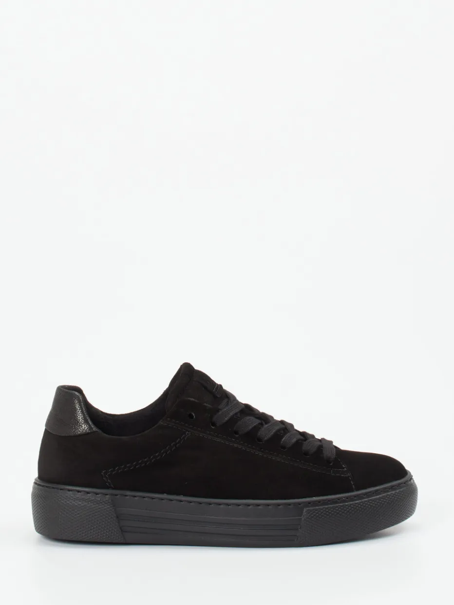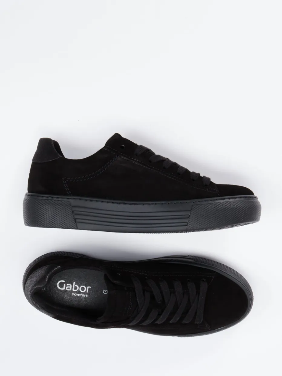 Stilvoll durch den Alltag.Gabor Comfort präsentiert mit diesem Damen-Plateau-Sneaker einen stilbewussten Freizeitschuh aus edlem, samtig angeschliffenem Veloursleder. Schwarz ist Trumpf – das monochrome Design mit tonaler Schnürung, matter Oberfläche und glänzender Fersenkappe schafft ein urbanes Gesamtbild. Die strukturierte Gummisohle verleiht mit ihrer abriebfesten Ausführung Trittsicherheit, während das herausnehmbare, gepolsterte Fußbett langanhaltenden Tragekomfort ermöglicht. Minimalistische Formgebung trifft auf Trends wie „Platform Soles“ und „Monochrome Looks“. Besonders gut kombinierbar zu lässigen Jeans oder monochromen Outfits. Die typische Gabor-Qualität vereint Komfortweite mit smarter Alltagstauglichkeit.