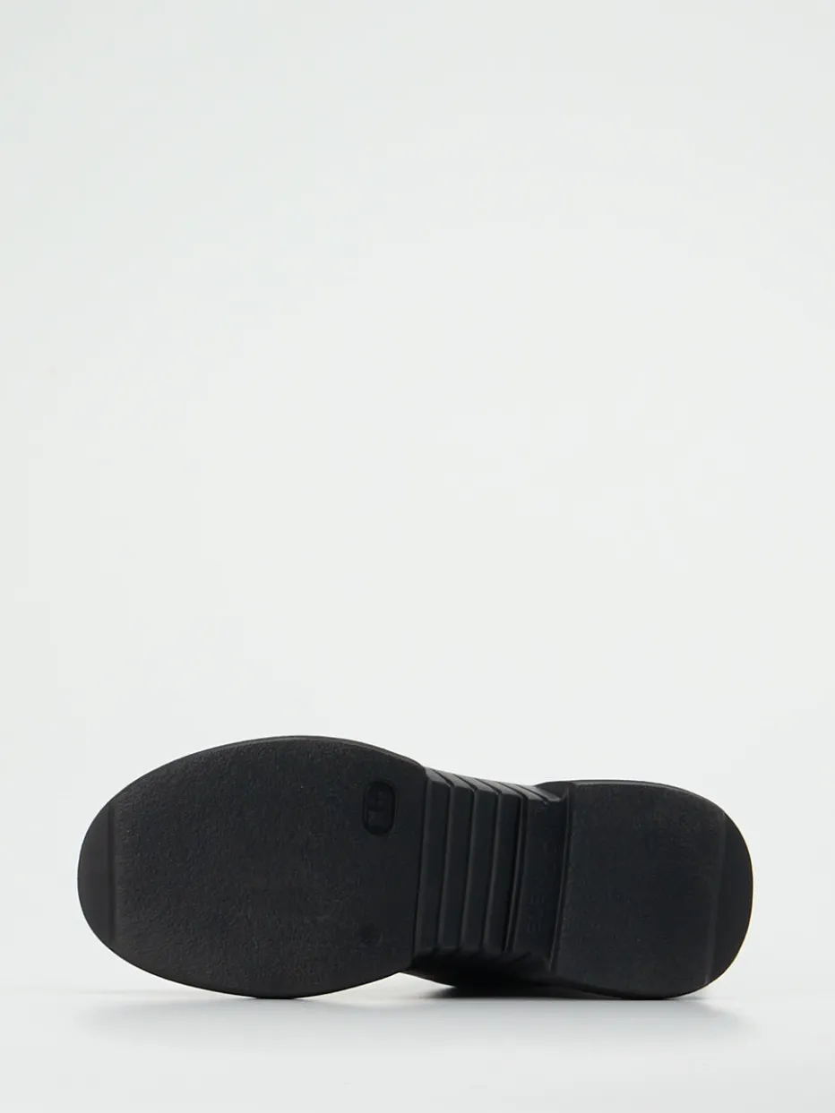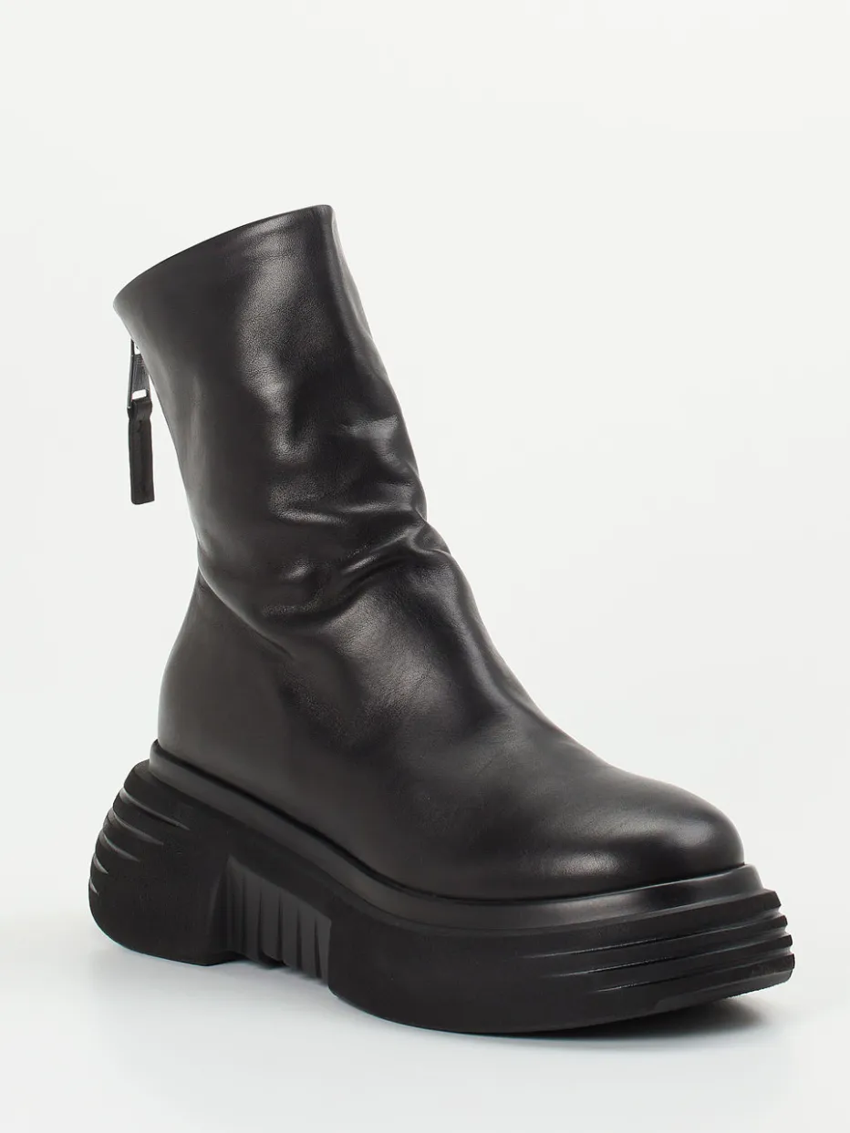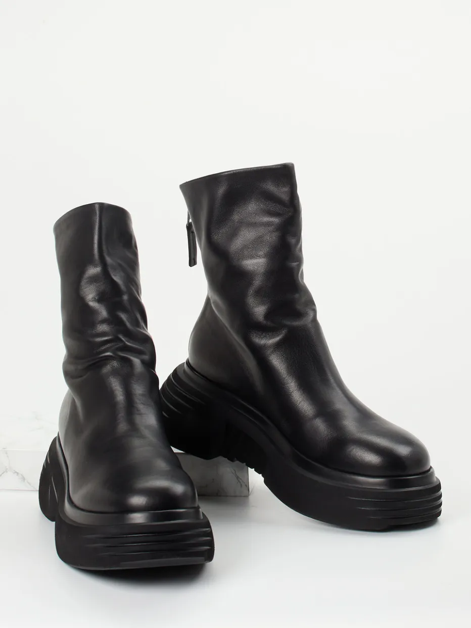 Ob beim Ausgehen oder im Alltag – die extra leichte Plateausohle mit horizontaler Struktur bietet kräftigen Grip und ist dabei überraschend bequem. Schwarzes Kalbleder und matte Oberfläche sorgen für eine kompromisslose Eleganz, akzentuiert durch einen rückseitigen Reißverschluss mit Zuglasche. Die voluminöse Silhouette greift den Chunky-Trend der Saison auf und fügt sich souverän in Streetwear-Looks ein. Harmoniert besonders gut mit Oversized-Mänteln und monochromen Accessoires.