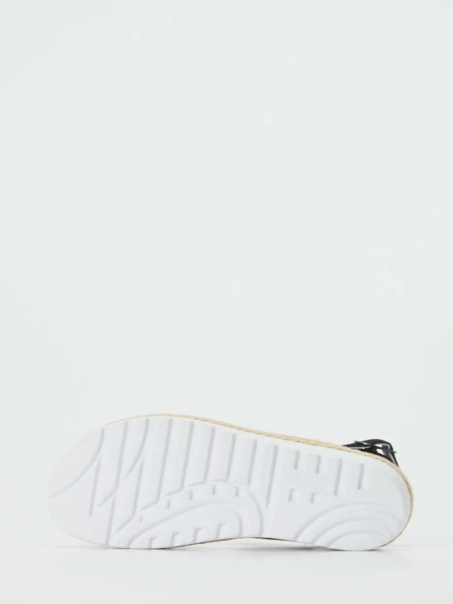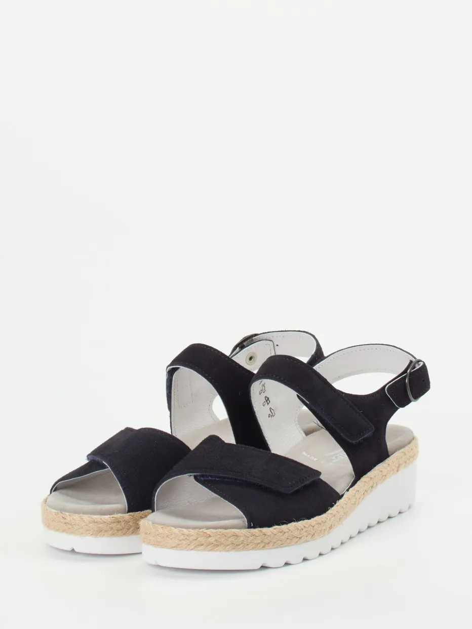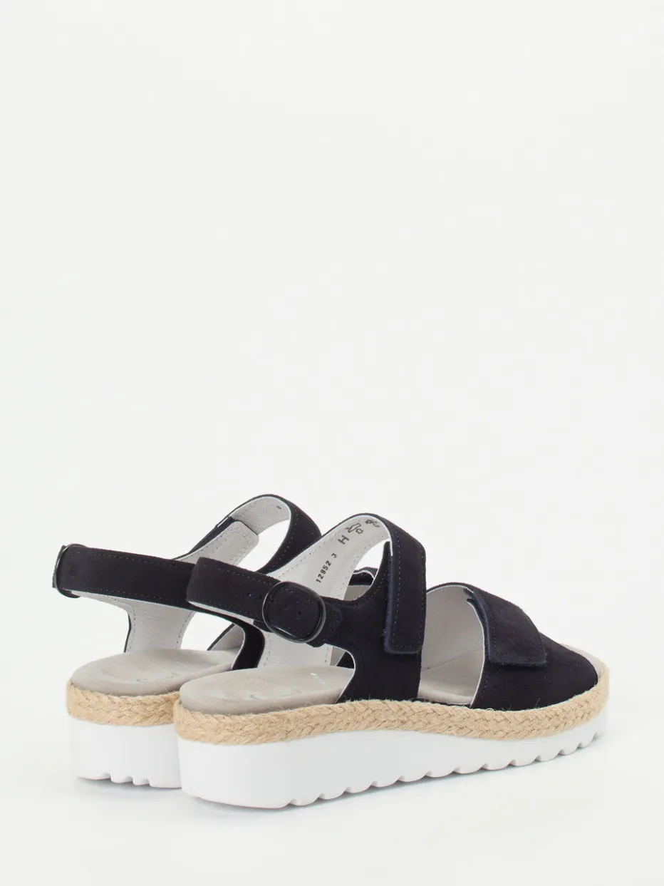 Stilvoll in den Sommer.Die Marke Semler präsentiert hier eine komfortorientierte Damen-Sandalette mit Plateausohle. Ob im Stadtbummel oder am Urlaubsort: Das Modell aus blauem Veloursleder mit samtig-matter Oberfläche überzeugt durch seinen relax-ten Look und bequemes Tragegefühl. Das gepolsterte, herausnehmbare Fußbett unterstützt auch eigene Einlagen, während Klettverschlüsse und verstellbarer Fersenriemen für passgenauen Halt sorgen. Weiße Gummisohle mit rutschfester Profilierung und sommerlicher Jute-Umrandung setzen dezente Akzente. Ein stimmiger Mix aus minimalistischer Designsprache und trendiger Natürlichkeit. Lässt sich ideal mit Leinenkleidern oder Basttaschen kombinieren. Perfekt für entspannte Sommermomente mit komfortvollem Anspruch.