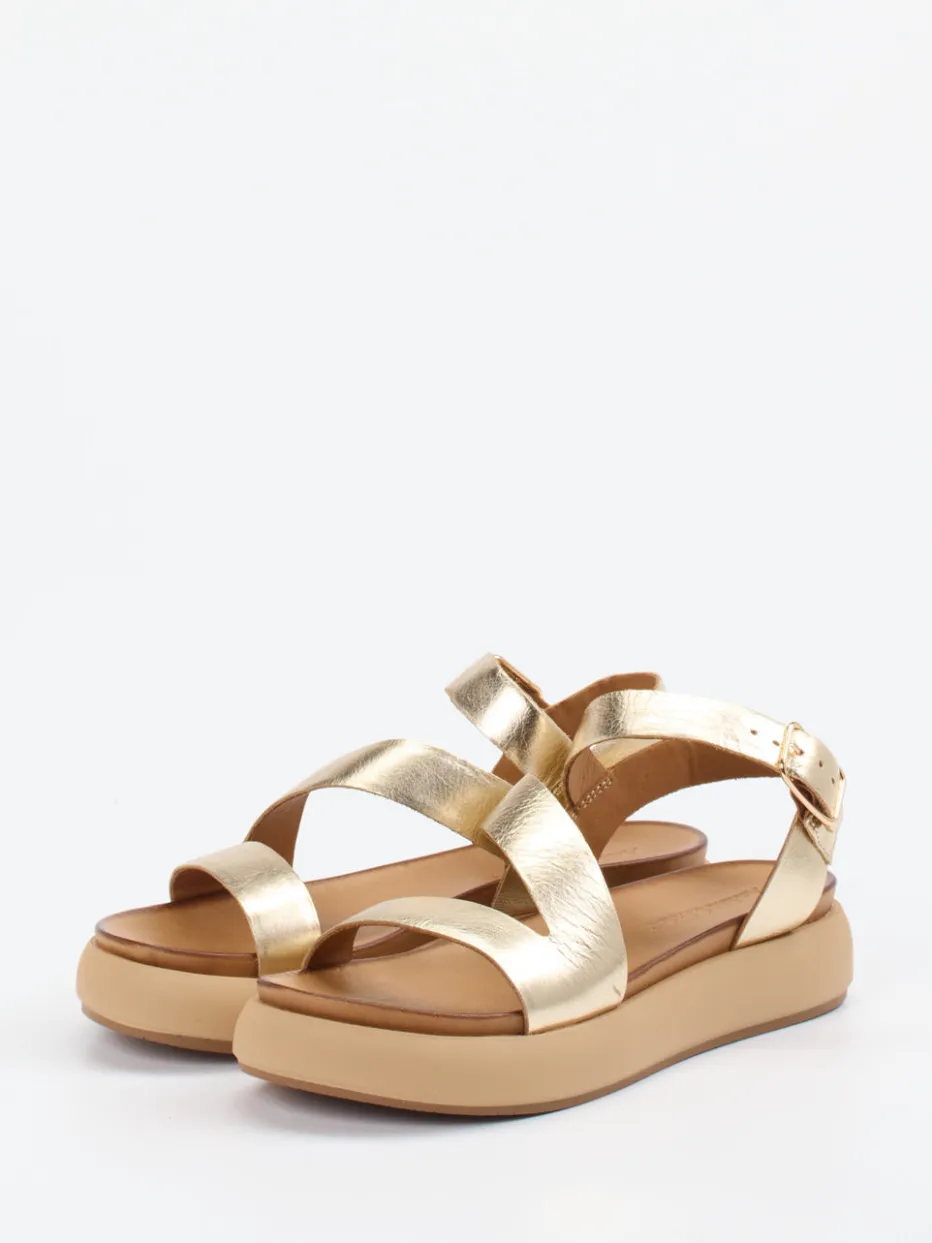 Sommerlicher Stil trifft Metallic-Komfort.Andrea Sabatini präsentiert eine elegante Damen-Plateausandale aus hochwertigem Kalbleder. Ideal für sommerliche Stadtbummel oder Strandpromenaden – das glänzende Metallicleder in Gold verleiht diesem Modell eine edle Anmutung, während das leichte Narbenbild dem Look Tiefe gibt. Die offene Silhouette mit Kreuzbandführung und verstellbarem Fersenriemen sorgt für sicheren Halt. Die breite, weich gepolsterte Gummisohle bietet angenehmen Laufkomfort und folgt dem Trend zu Plateauformen und Metallic Accents. Kombiniert mit Leinentasche und hellen Sommerkleidern wirkt das Modell besonders modern. Femininer Stil mit einem Hauch luxuriöser Zurückhaltung – typisch Andrea Sabatini.