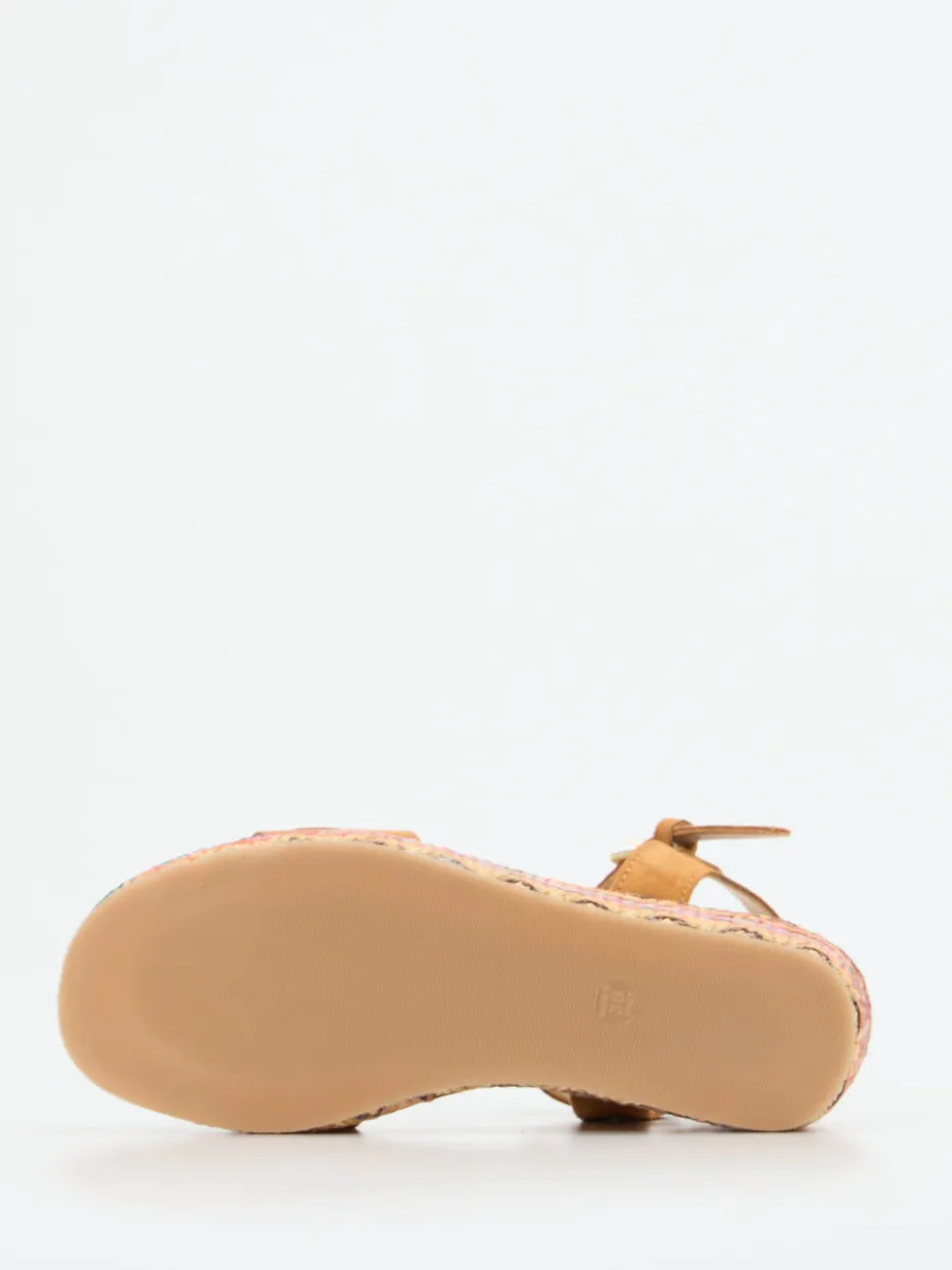 Boho-Glamour trifft farbenfrohe Handwerkskunst.Konstantin Starke präsentiert mit dieser Plateausandale ein stilvolles Damenmodell für die warme Jahreszeit. Perfekt für Urlaubsmomente oder entspannte Citytage: Der cognacbraune Velourslederriemen mit matt anmutender Oberfläche harmoniert reizvoll mit einer mehrfarbig geflochtenen Jute-Plateausohle im Zickzackdesign. Funkelnde Akzente setzt die goldfarbene Dornschließe mit Strassbesatz am Knöchelriemen. Die keilförmige Silhouette bietet durch 8 cm Absatzhöhe und gepolsterte Ledersohle angenehmen Tragekomfort. Stilistisch orientiert sich das Modell an der Retro- und Boho-Ästhetik, passend zur SS24-Platform-Trendwelle. Ein Blickfang, der Komfort und Trendgespür gekonnt verbindet.
