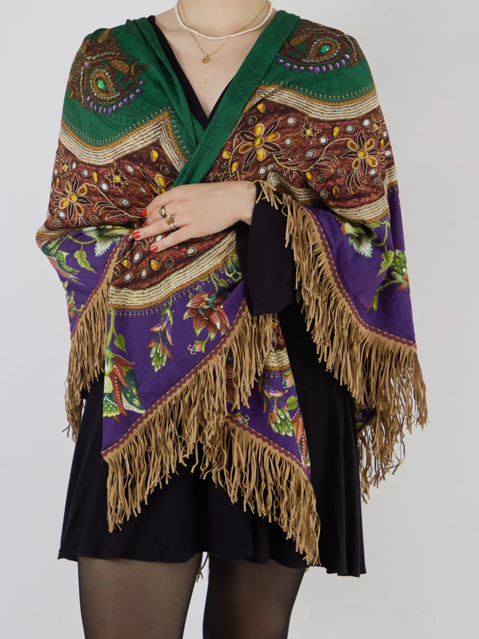 Ein farbenreiches Accessoire mit Ethno-Flair: Fransenbesatz, Elefantenmotiv und Boho-Einflüsse machen dieses Poncho-Tuch von Katherina Loretta zu einem stilprägenden Lieblingsstück.