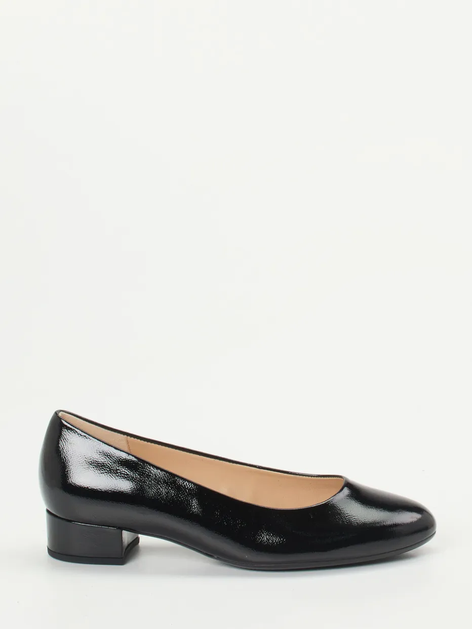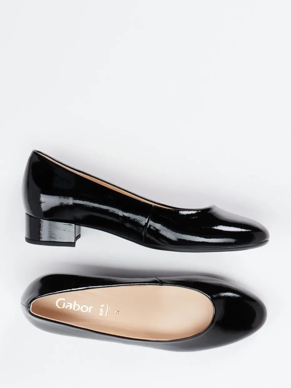 Glanzvoller Auftritt mit klassischem Anspruch.Die Marke Gabor präsentiert klassische Damenpumps mit charakteristischer Silhouette. Der glänzend-schwarze Lackleder-Finish verleiht dem minimalistischen Design eine elegante Spannung. Die abgerundete Form, der komfortable Blockabsatz und die Schlupfform machen den Schuh zum stilvollen Begleiter bei Festlichkeiten oder im Berufsalltag. Innen sorgt ein weich gepolstertes Kalblederfutter in Nude-Ton für angenehmen Tragekomfort. Ton-in-Ton gearbeitete Nähte und ein rutschhemmendes Sohlendesign runden das Modell hochwertig ab. Ein stilbewusstes Statement in der Welt des „Quiet Luxury“ – mit Gabor-typischer Bequemlichkeit.