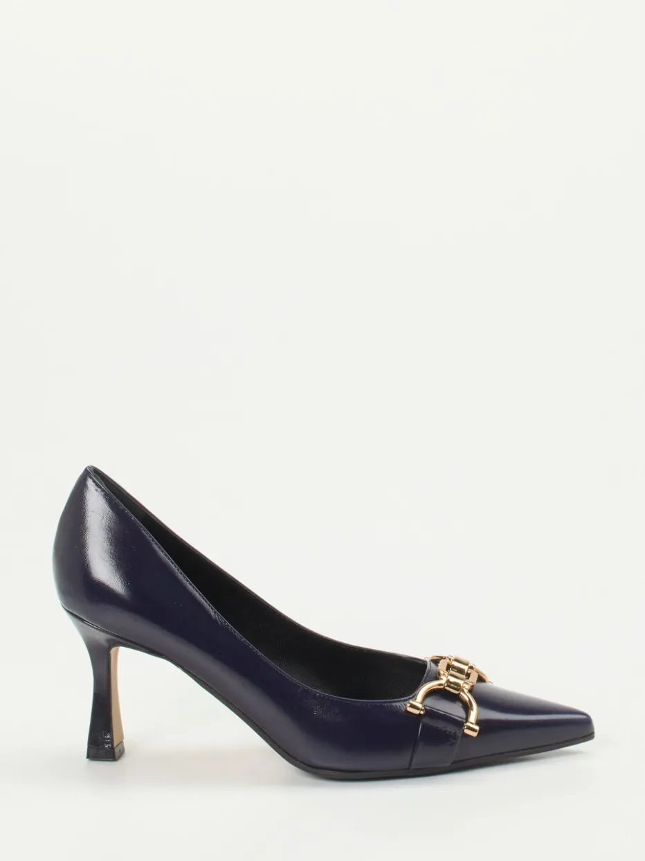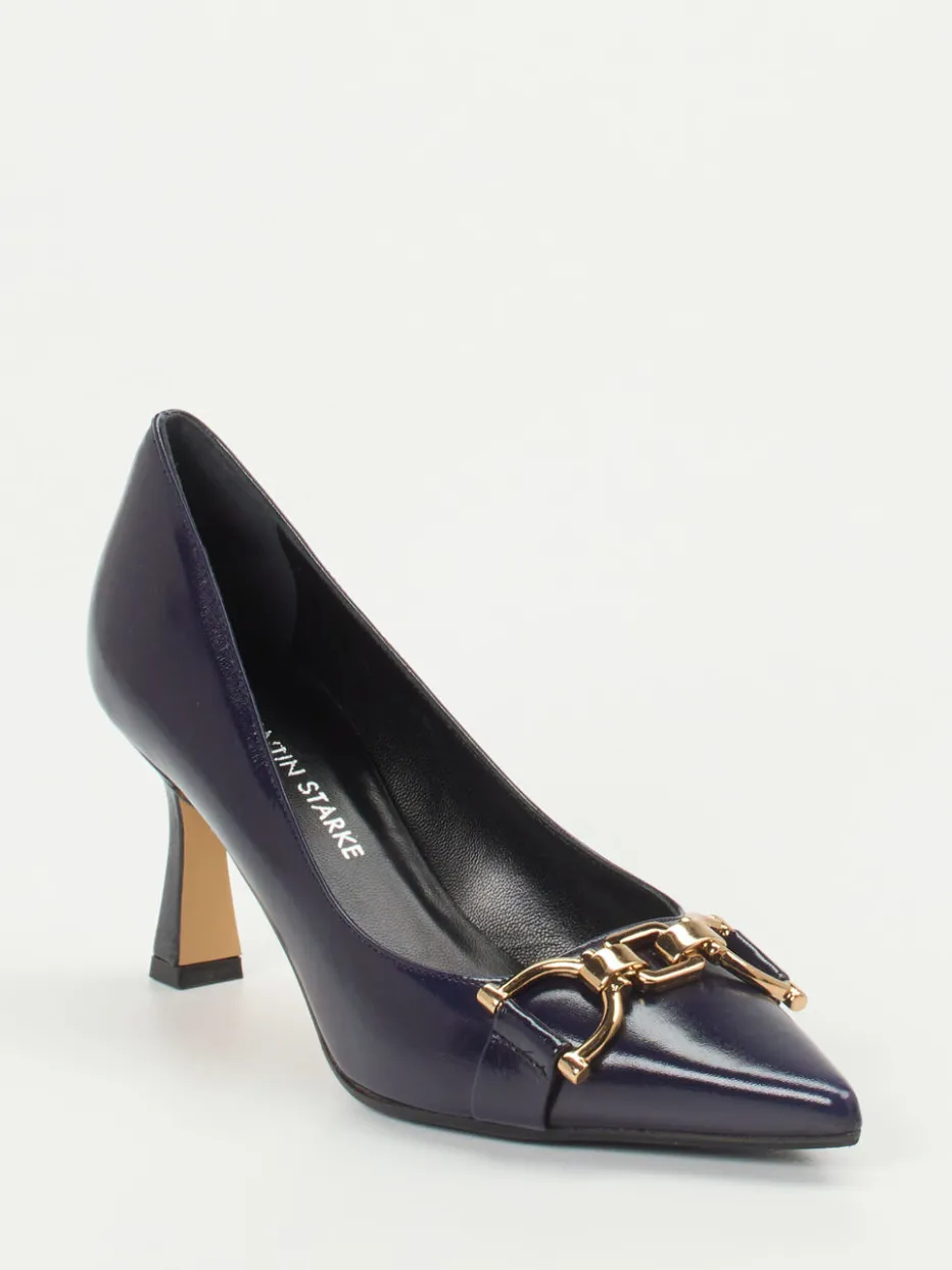 Stilsicherer Auftritt mit Glanz.Konstantin Starke interpretiert klassische Damen-Pumps in edlem Lackleder neu. Für elegante Business-Meetings oder festliche Anlässe bietet die spitz geformte Silhouette in tiefem Dunkelblau mit glanzvoller Oberfläche stilvolle Präsenz. Eine goldfarbene Trensengarnitur auf dem Vorderblatt akzentuiert das minimalistische Design. Der circa 7 cm hohe Kitten Heel sorgt für femininen Schwung, während die halbledere Sohle mit Gummieinsatz optimalen Tragekomfort garantiert. Der Vintage-inspirierte Look greift den Trend „Quiet Luxury“ klar auf. Ideal zu schmal geschnittenen Stoffhosen oder einer Seidenbluse. Ein stilvoller Begleiter mit handwerklicher Raffinesse.