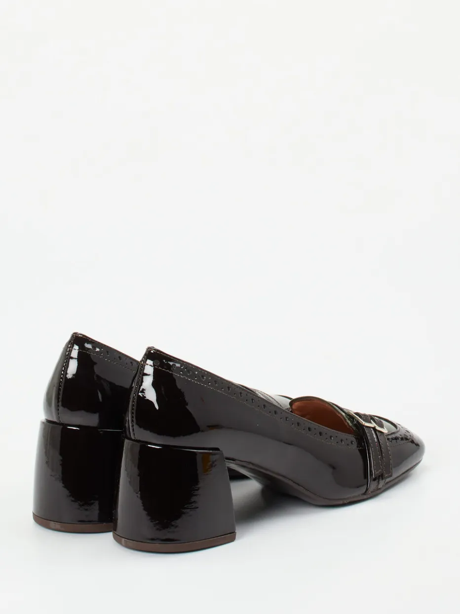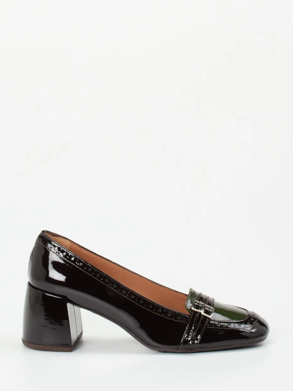 Ideal für stilvolle Office-Looks oder einen gehobenen Freizeitauftritt bieten diese Pumps in glänzendem Lackleder komfortablen Halt. Der dominant schwarze Schaft mit kontrastierend olivgrüner Vorderpartie wird mittels Brogue-Details und filigraner Zierschnallen veredelt. Die klassische Silhouette mit Blockabsatz verbindet Vintage-60s-Flair mit moderner Eleganz. Eine gepolsterte Innenausstattung aus Kalbleder sorgt für angenehmen Tragekomfort über Stunden. Der Retro Loafer Look fügt sich perfekt in aktuelle „Quiet Luxury“-Tendenzen ein – kombinierbar etwa mit Seidenbluse oder Hosenanzug.