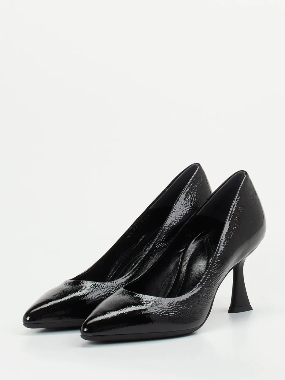 Ideal für besondere Anlässe oder stilvolle Abend-Events: Das spiegelnd glänzende, schwarze Lackleder und die spitz zulaufende Silhouette verkörpern puristische Eleganz. Der skulpturale, kantige Absatz setzt ein modernes Design-Statement und verleiht dem Modell eine besondere architektonische Note. Eine weich gepolsterte Innensohle aus Ziegenleder sorgt für ein angenehmes Laufgefühl, während die rutschfeste Gummisohle sicheren Stand garantiert. Im Trendfeld „Quiet Luxury“ positioniert, passt der Schuh ideal zum minimalistischen Tailoring oder zur schlichten Cocktailrobe.
