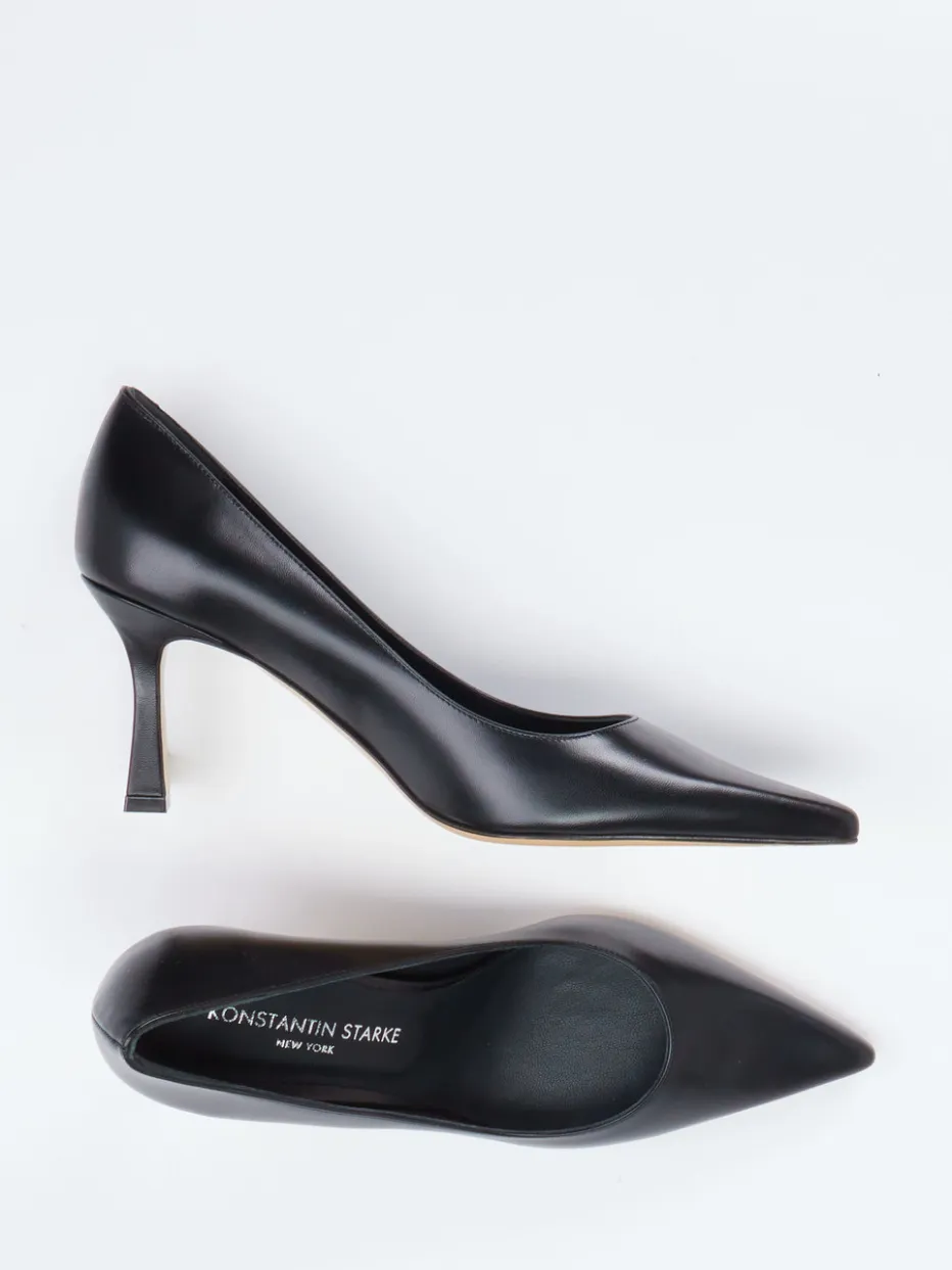 Eleganz mit architektonischem Anspruch.Die Marke Konstantin Starke zeigt bei diesen Damenpumps aus Lammleder ihr Faible für zeitlose Stilistik. Ideal für das Business oder besondere Anlässe, überzeugen diese High Heels durch schwarzes, glänzendes Lammleder mit samtweicher Haptik. Die klassisch-spitz zulaufende Form, ein filigraner Kitten Heel mit lackierter Oberfläche und Ton-in-Ton-Nähte unterstreichen den „Quiet Luxury“-Look. Die Ledersohle sorgt für eine schlanke Silhouette ohne Profil. Kombiniert mit Hosenanzug oder Seidenkleid entsteht ein konsequent elegantes Gesamtbild. Ein Modell mit moderner Femininität – souverän, klar, kompromisslos stilvoll.