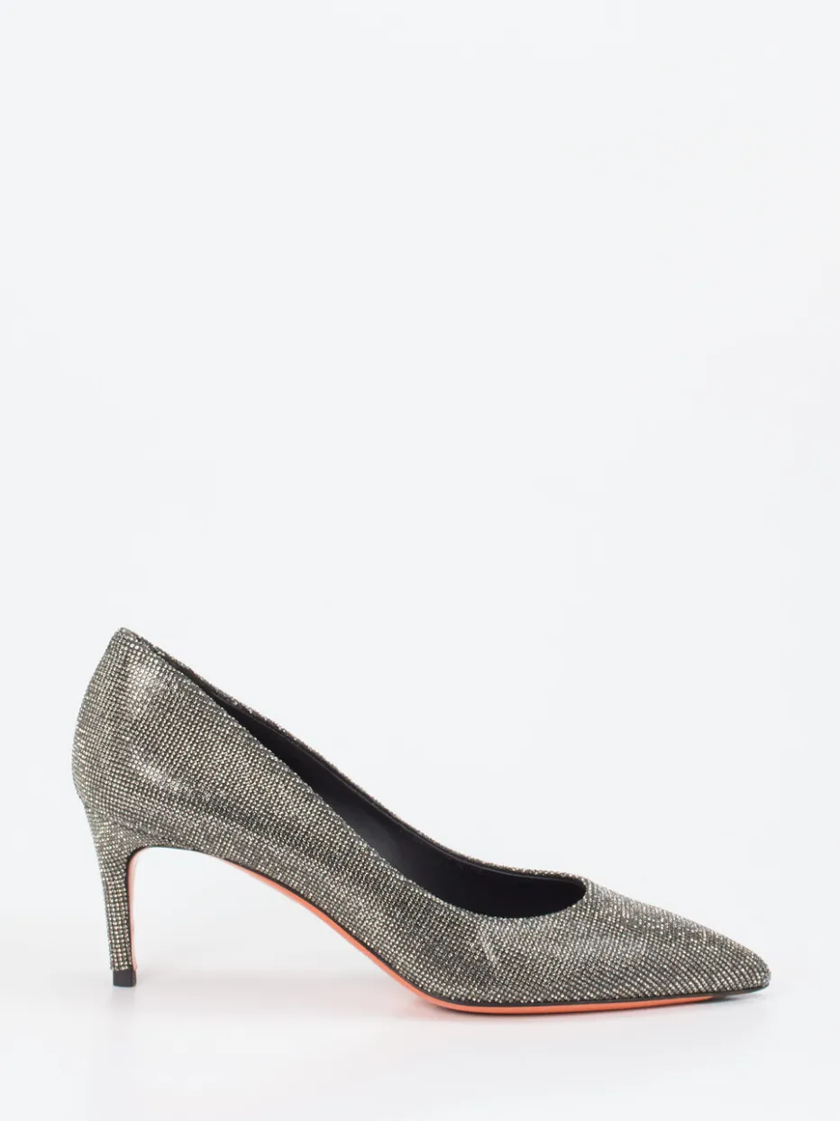 Glamour trifft Handwerkskunst.Santoni interpretiert klassische Damenpumps neu – mit einem Hauch Opulenz. Für Auftritte mit Wirkung: Diese silberfarbenen High Heels aus Metallic-Textil mit Glitzerbesatz überzeugen durch ihre spitz zulaufende Silhouette und den eleganten Kitten Heel. Die glänzende Feinstruktur greift aktuelle Trends wie „Quiet Luxury“ und „Metallic Accents“ auf. Innen sorgt edles Kalblederfutter für angenehmen Tragekomfort, während die orangefarbene Signature-Gummisohle festen Halt garantiert. Ideal zu Abendkleidern oder formellen Looks. Ein exklusives Modell mit ikonischer Linienführung – typisch Santoni.