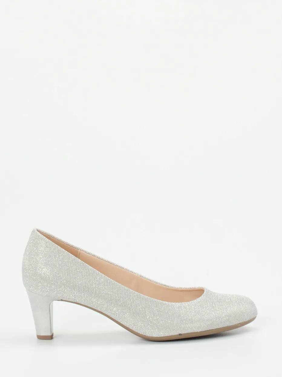 Die Marke Gabor präsentiert feminine Pumps im edlen Metallic-Look. Ob Hochzeit, festliches Event oder eleganter Abend – der silberfarbene Glitzer-Look verleiht jedem Auftritt eine stilvolle Note. Das Metallicleder beeindruckt durch seine feine Glitzerbeschichtung und angenehme Haptik. Der tonale, rund bezogene Absatz (ca. 5,5 cm) harmoniert mit der klassisch-runden Silhouette und sorgt für sicheren Stand. Innen sorgt eine Kombination aus Leder und Textil für Tragekomfort – unterstützt vom weich gepolsterten Fußbett und der profilierten Gummisohle. Die Optik greift dezente Vintage-Elemente auf und lässt sich elegant mit Metallic-Accessoires kombinieren. Ein raffinierter Pumps mit Charakter und zuverlässigem Komfort – stiltypisch Gabor.
