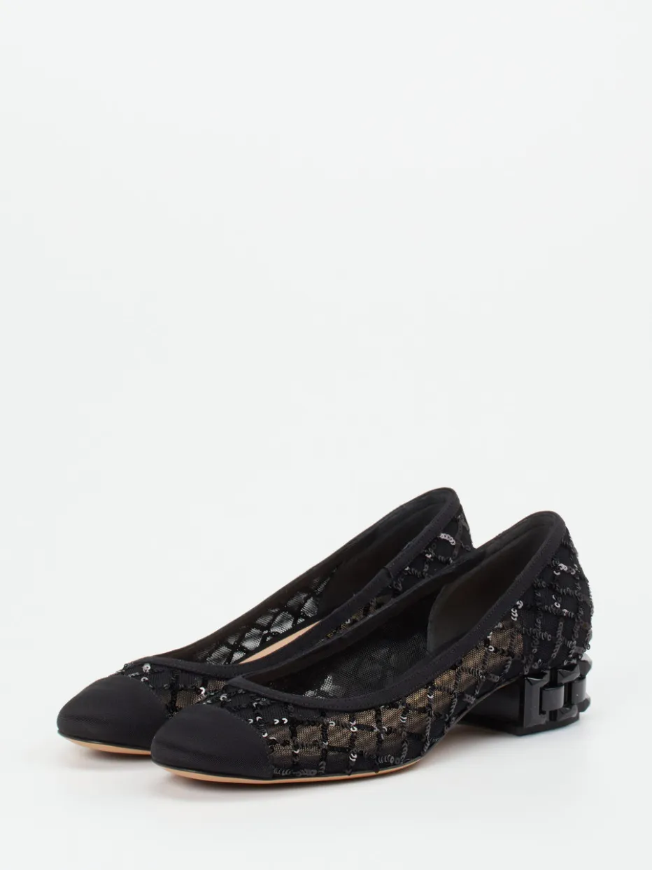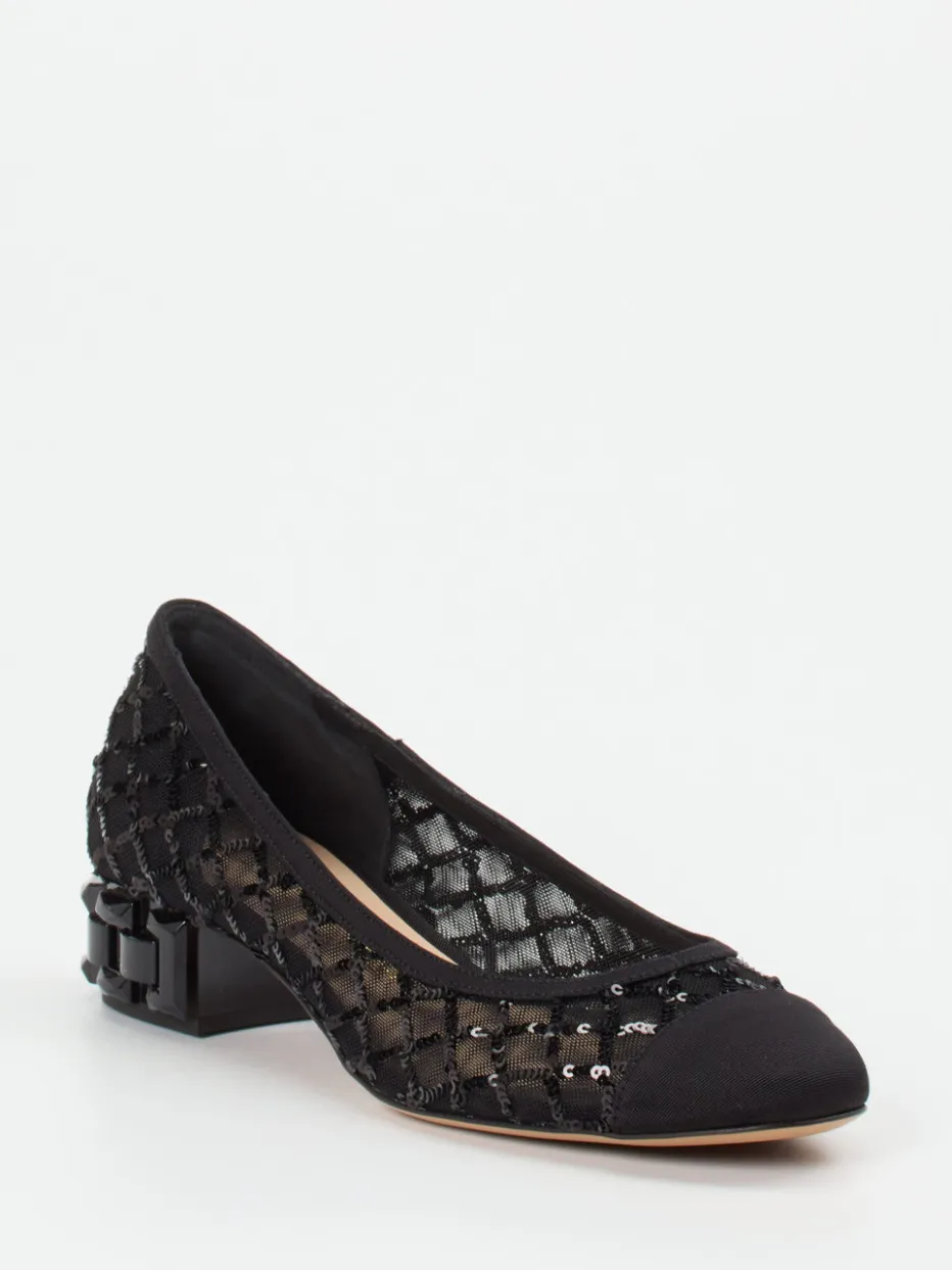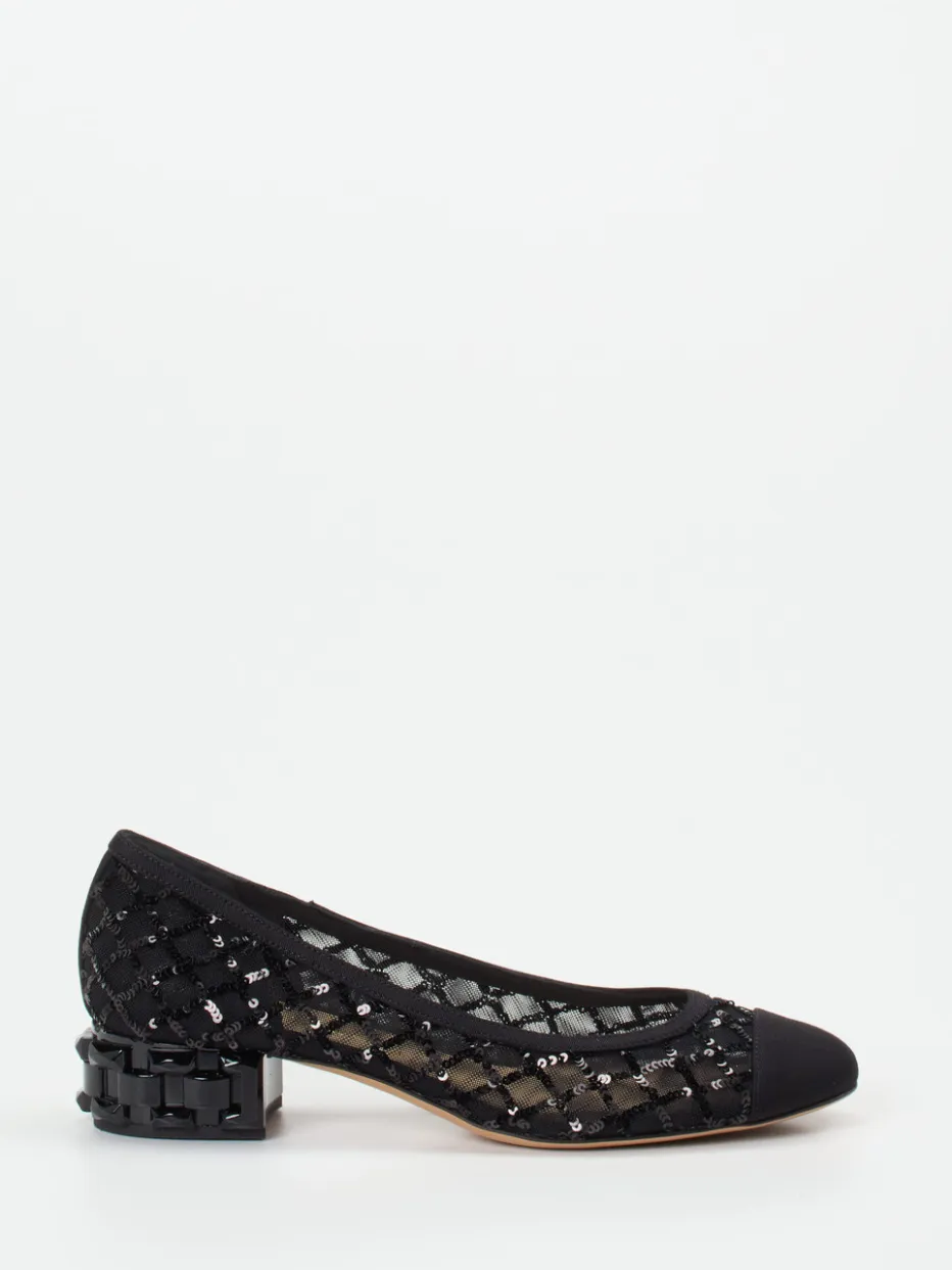 Ein stilvoller Begleiter für Abendveranstaltungen: Der halbtransparente Mesh-Pumps mit Pailletten überzeugt durch seine dezente Extravaganz und den kunstvoll gestalteten Blockabsatz.