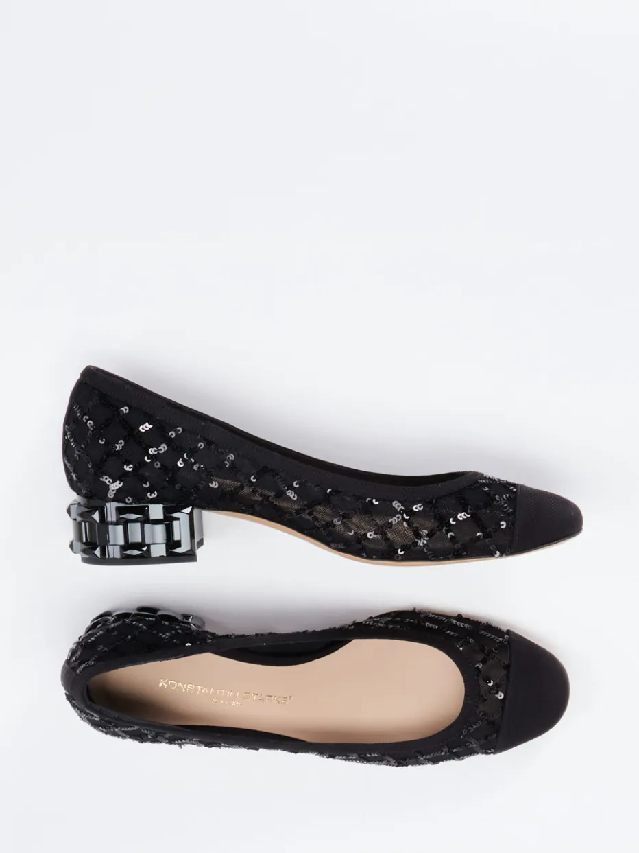 Effektvoller Auftritt mit Vintage-Flair.Die Marke Konstantin Starke präsentiert elegante Damenpumps der festlichen Art. Ideal für Events mit Glamour-Faktor: Das schwarze Textilmaterial zeigt sich in einer halbtransparenten Mesh-Optik mit glänzenden Pailletten und bietet raffiniert schimmernde Akzente. Der klassische, rund geschlossene Schnitt kombiniert mit einem geometrisch strukturierten Blockabsatz erzeugt eine stilvolle Silhouette. Die Schlupfform ermöglicht komfortables Anziehen, während die Lederinnensohle für angenehmen Tragekomfort sorgt. Inspiriert vom Minimalismus der 90er-Jahre, passt dieser Statement-Schuh perfekt zu aktuellen Texturtrends. Kombiniert mit einer schwarzen Feinstrumpfhose wirkt der Look besonders ausdrucksstark. Stil und Tragekomfort vereint in einem ausdrucksstarken Design.