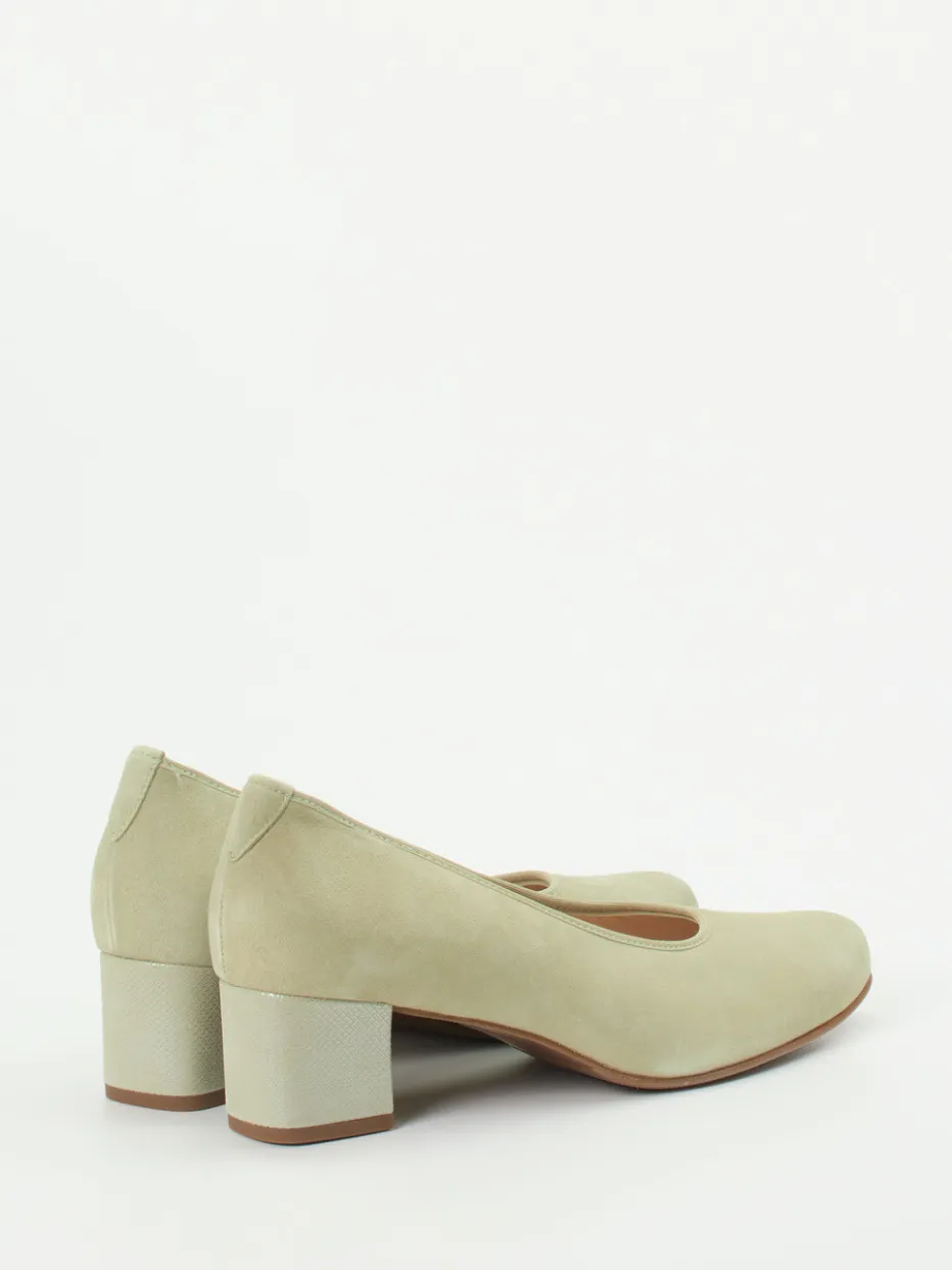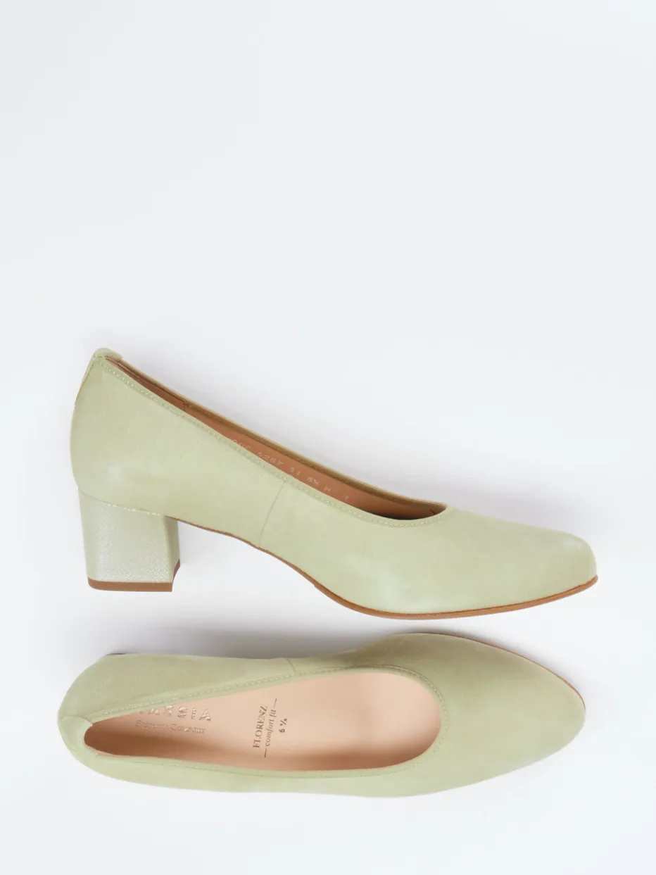 Pastellig, bequem, vielseitig tragbar.Hassia präsentiert hier einen klassischen Damenpumps mit Blockabsatz in sanftem Salbeigrün. Für stilbewusste Auftritte im Büro oder Alltag bietet dieser Schuh mit seinem weichen Veloursleder, das samtig angeschliffen ist, und mit rutschhemmender Sohle idealen Komfort. Die klassische Silhouette mit rundem Leisten wird durch klare Ton-in-Ton-Nähte und einen leicht strukturierten, textilbezogenen Absatz akzentuiert. Die weich gepolsterte Innensohle lässt sich durch eigene Einlagen ersetzen – perfekt für komfortorientiertes Styling im Sinne von Quiet Luxury. Tonale Pastellfarben und minimalistischer Chic unterstreichen den Trendbezug. Ein eleganter Begleiter mit ergonomischer Passform – typisch Hassia.
