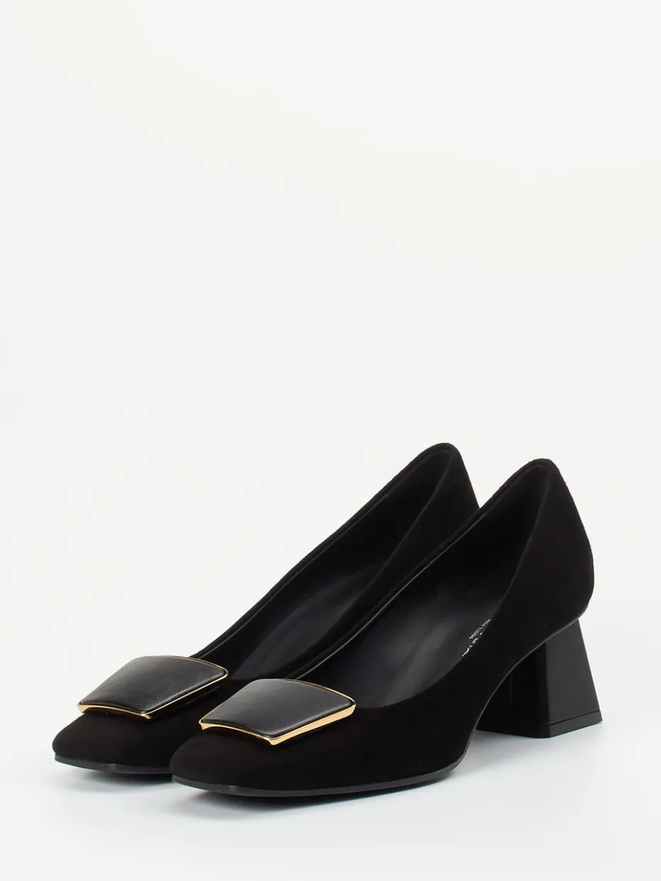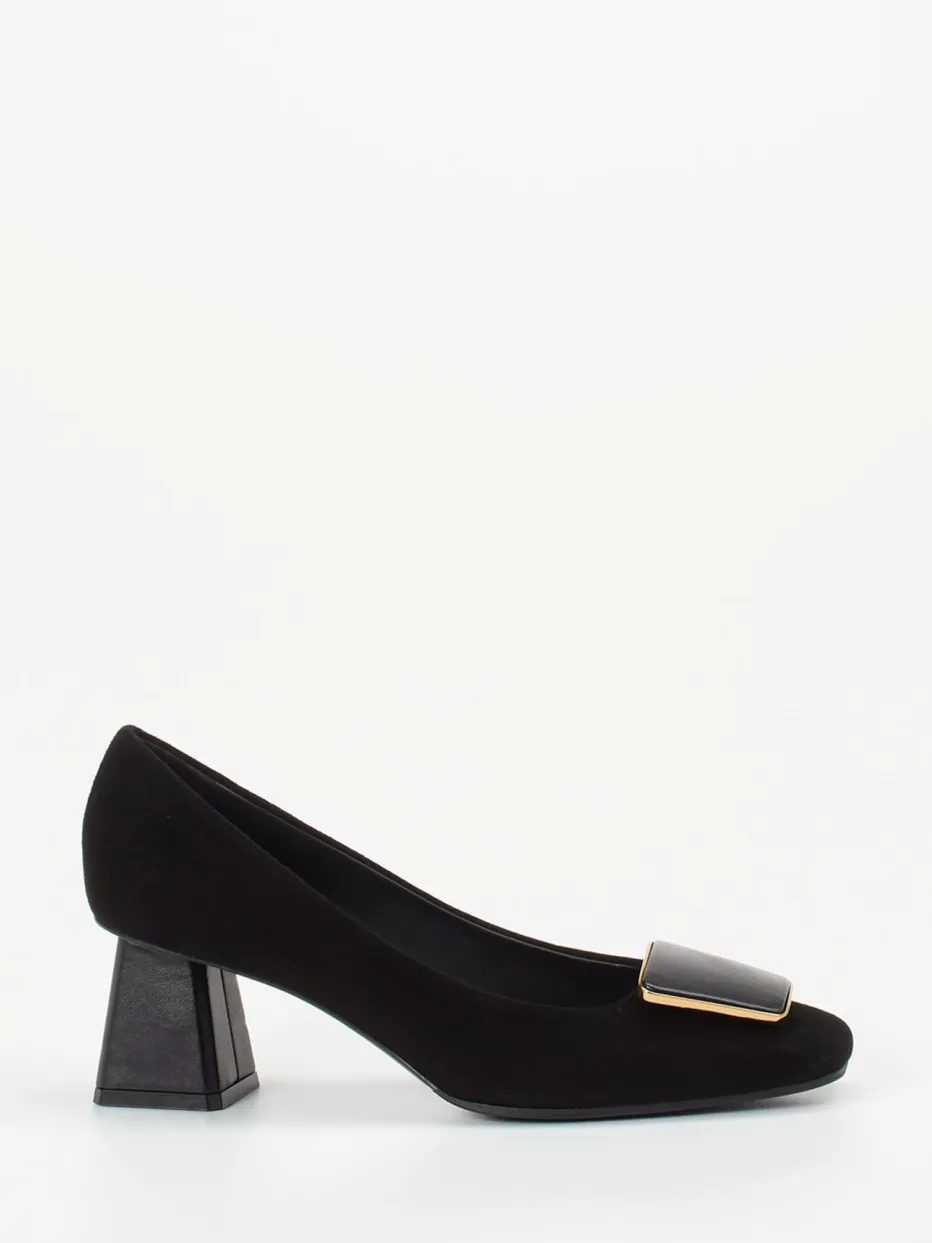 Schwarzes Veloursleder, eine goldgerahmte Zierschnalle und ein stabiler Blockabsatz verbinden sich zu einem formvollendeten Klassiker mit modernem Understatement.