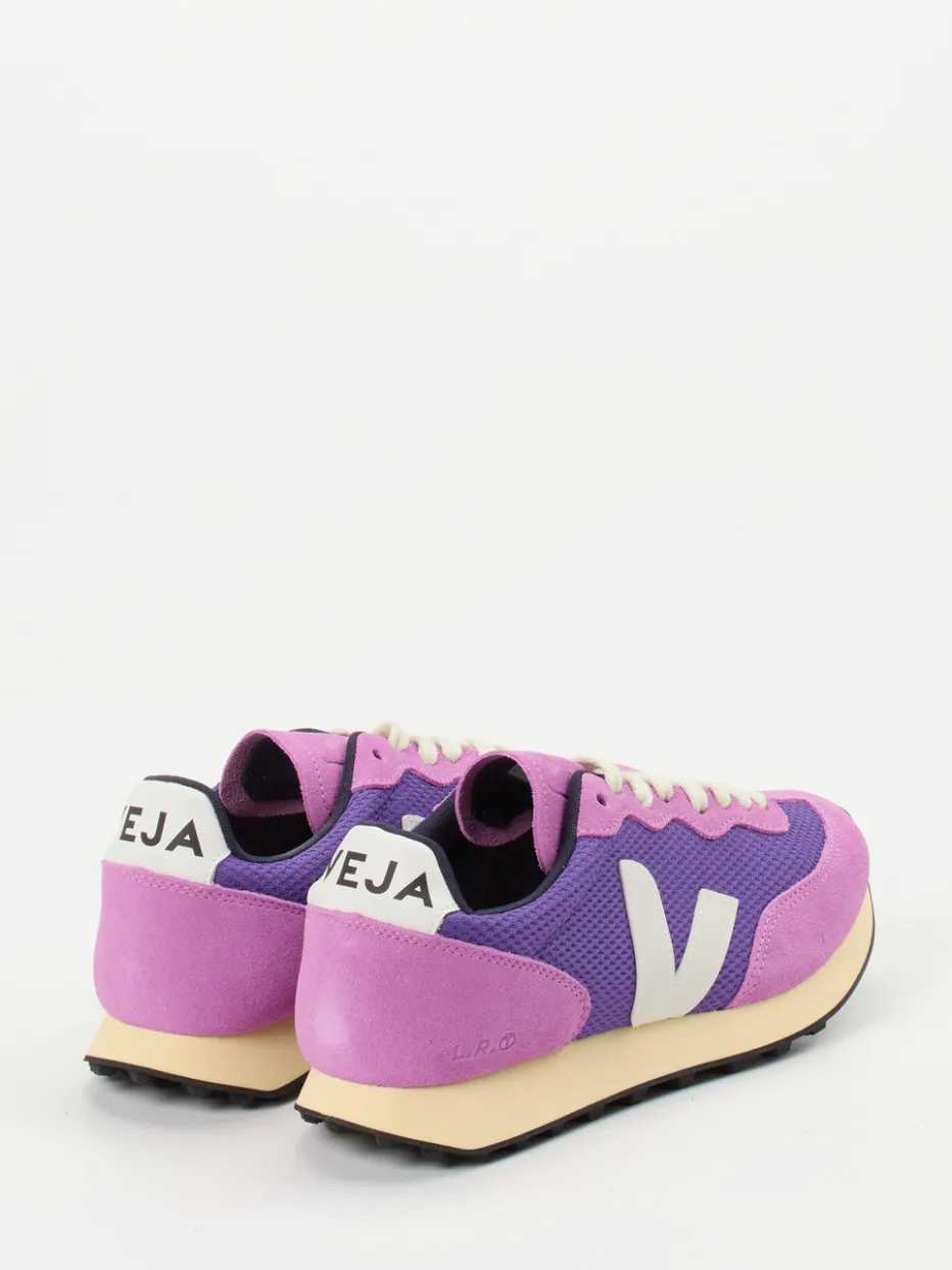 Urbaner Klassiker mit Retro-Vibe.Veja präsentiert mit dem Sneaker-Modell aus der Rio Branco-Serie einen Retro-inspirierten Runner für Alltag und Freizeit. Das violettfarbene Obermaterial kombiniert atmungsaktives Hexamesh aus Bio-Baumwolle mit samtig angeschliffenem Veloursleder in helleren Tönen. Markant präsentiert sich das weiße Lederlogo im Kontrast zur klassischen Runner-Silhouette mit profilierter Gummisohle und Ton-in-Ton-Nähten. Die fest vernähte Schnürung sorgt für sicheren Halt, während das lila Colorblocking modische Streetwear-Einflüsse aufgreift. Perfekt für trendbewusste Styles im urbanen Alltag oder sportiven Freizeit-Look. Nachhaltiger Stil und hoher Komfort im typisch minimalistischen Veja-Design.