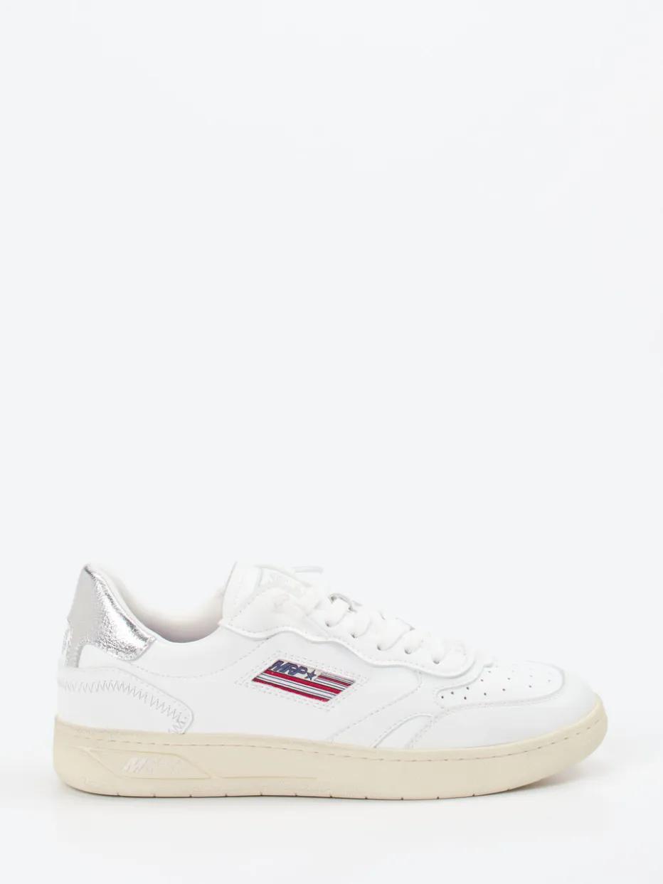 Retro trifft Moderne in Hingucker-Optik.MRP präsentiert diesen Unisex-Retro-Sneaker in klassischer Court-Silhouette mit trendigem Streetwear-Appeal. Ideal für urbane Freizeitlooks: Das weiße Kalbleder mit mattierter Oberfläche wird durch eine silberfarbene Metallic-Fersenkappe effektvoll ergänzt. Eine perforierte Zehenkappe, farbig akzentuiertes Seitenlogo und offwhite-getönte Gummisohle betonen den angesagten Y2K-Vibe. Die flache Passform mit Schnürverschluss bietet hohen Tragekomfort, das gepolsterte Textilfutter unterstützt den entspannten Alltagsauftritt. Perfekt kombinierbar mit Cropped Jeans und Sportsocken für ein modernes Styling. MRP setzt hier auf hochwertige Verarbeitung und modische Substanz im Retro-Design.