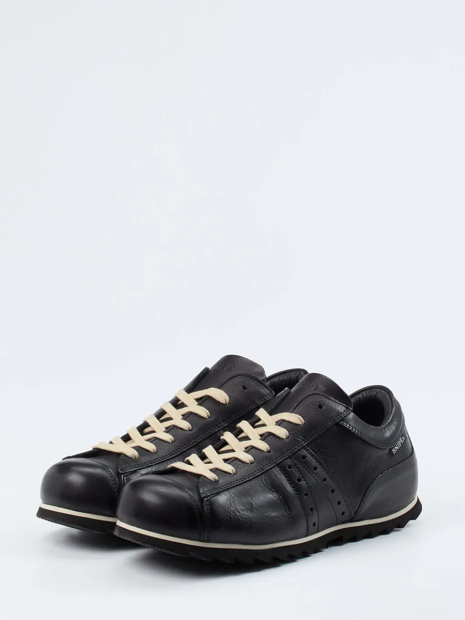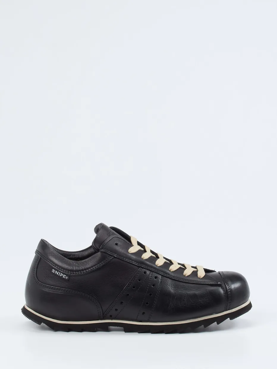 Vintage-Charme für jeden Tag.Snipe präsentiert einen Retro-Sneaker für Herren, der Stilbewusstsein mit Komfort verbindet. Durch das tiefschwarze Kalbleder mit genarbter Oberfläche und kontrastierende Schnürsenkel entsteht ein subtiler Hingucker im minimalistischen Streetwear-Stil. Die klassische, flache Silhouette wird durch eine markante Gummisohle mit Rillenprofil ergänzt, die rutschhemmenden Halt garantiert. Innen überzeugt der Sneaker mit weich gepolstertem Lederfutter und einem bequemen, herausnehmbaren Memory-Fußbett. Ideal für urbane Looks mit Vintage-Note und perfekt kombinierbar zu Jeans oder Lederjacke. Modern interpretierter Retro-Stil mit Snipe-typischer Komfortqualität.