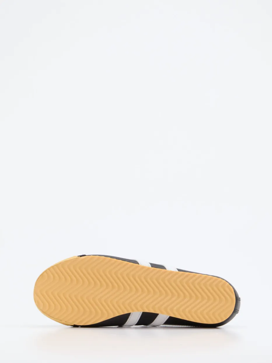 Für entspannte Spaziergänge oder den alltäglichen City-Style überzeugt der Sneaker mit glattem Leder, samtigem Velours-Besatz an der Zehenpartie sowie einer flachen, zweifarbigen Gummisohle. Die dominante Farbe Schwarz wird von weißen Kontraststreifen und einem goldfarbenen Logo akzentuiert. Die schmale Silhouette, klassische Schnürung und das Fischgrätenprofil runden den Vintage-Look funktional ab. Ideal für alle, die minimalistischen Stil mit Retro-Charme suchen. Lässt sich vielseitig zu Denim, Jogger oder Casual Dresses kombinieren.