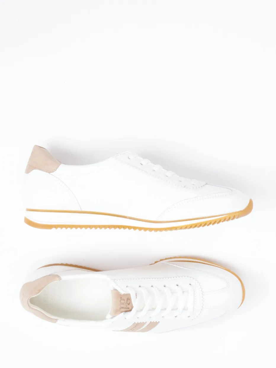 Sommerlicher Stil mit Vintage-Flair.Der Damen-Sneaker von Paul Green vereint Retro-Ästhetik mit moderner Zurückhaltung. Die Kombination aus glattem und samtigem Veloursleder sorgt für ein edles Erscheinungsbild, das in weiß-beiger Farbgebung besonders harmonisch wirkt. Mit flacher, schmaler Form, Schnürverschluss und tonigen Nähten zeigt sich das Modell bewusst reduziert. Die honigfarbene Gummisohle unterstreicht den 90s-inspirierten Look und verleiht Bodenhaftung. Minimalistische Details wie die geprägten Logos auf Zunge und Seite bedienen den Trend „Quiet Luxury“. Besonders passend zu hellen Sommer-Outfits und natürlichen Texturen. Stilbewusstes Design mit lässigem Komfort – typisch Paul Green.
