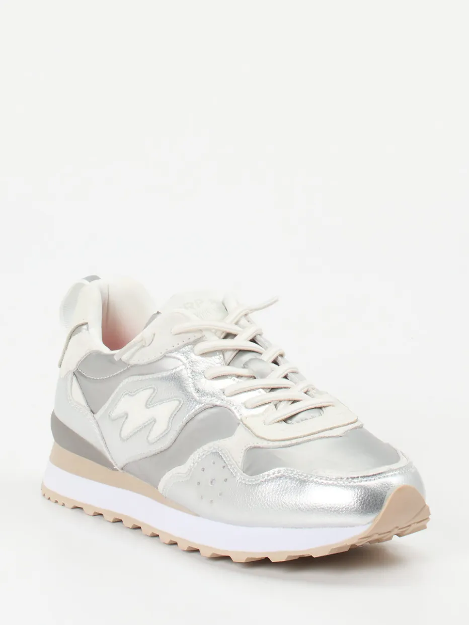 Glänzendes Statement für urbane Styles.MRP präsentiert mit diesem Sneaker für Damen einen Retro-Runner mit Flair. Ideal für Streetstyle-Momente zwischen Alltag und Ausgehen: Die Kombination aus silberfarbenem Metallic-Synthetikleder und atmungsaktivem Mesh macht den Look besonders expressiv. Dank der klassischen, niedrig geschnittenen Silhouette mit Schnürung, gepolstertem Schaft und profilierter Gummisohle bietet das Modell sichtbaren Vintage-Charme und hohen Komfort. Die Ton-in-Ton-Nähte unterstreichen die klare Linienführung, während Metallic-Akzente zu aktuellen AW24-Trends passen. Harmoniert gut mit Nylon-Joggern oder einer silbernen Crossbody Bag. Stylebewusste Optik mit extravaganter Streetwear-Note von MRP.