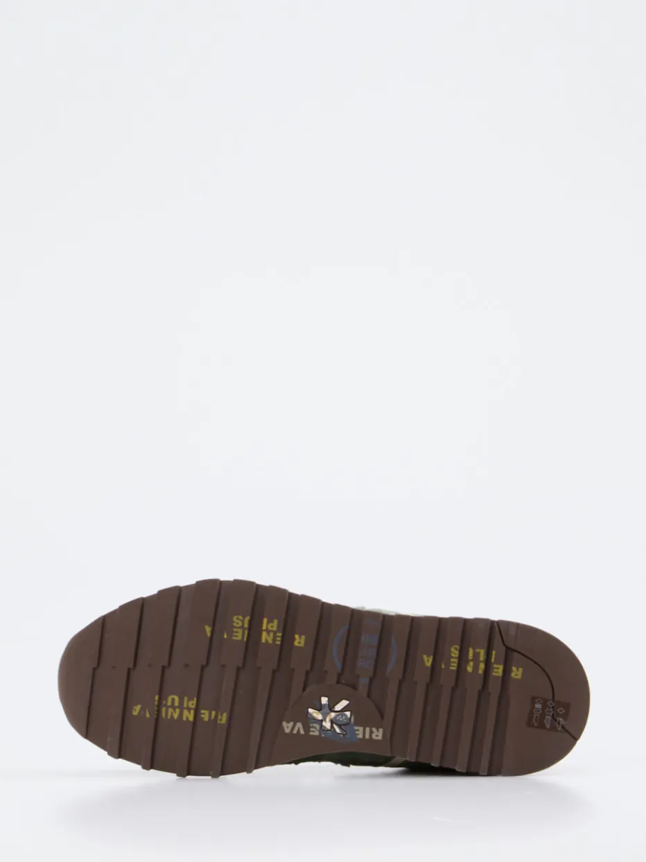 Vintage-Charme für moderne Streetstyles.Premiata präsentiert mit diesem Herren-Sneaker ein Modell im charakteristischen Retro Runner-Stil. Ideal für urbane Entdeckungstouren kombiniert der Schuh mattes Textil mit samtig angeschliffenem Veloursleder und griffiger Gummisohle. Farblich dominiert Olivgrün, ergänzt durch Beige- und Dunkelblauakzente. Die flache Silhouette, eine klassische Schnürung und das seitliche Markenlogo unterstreichen den Vintage-Look. Die beschriftete Printsohle greift gekonnt den Trend zu „Gorpcore“ und Streetwear-Ästhetik auf. Lässig zu Jogpants oder Crossover-Bags kombinierbar. Authentisch italienisches Design mit stilsicherem Retro-Flair.