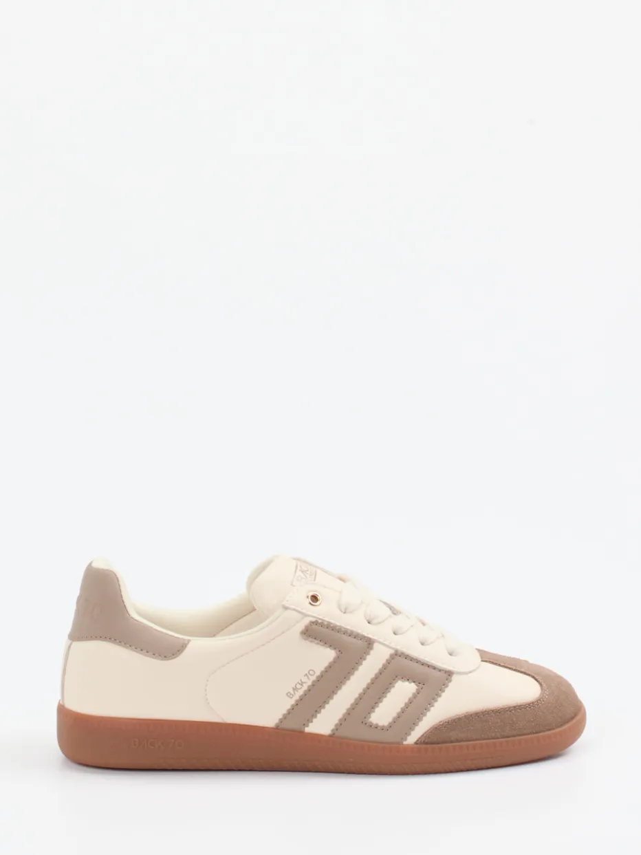Retro neu interpretiert. Back 70 präsentiert mit diesem Retro-Sneaker ein Unisex-Modell mit 70s-Flair. Für entspannte Alltagslooks kombiniert das Design geschmeidiges Kalbleder mit samtigem Velours in harmonischen Creme- und Taupetönen. Die flache, sportliche Silhouette wird durch seitliche Applikationen und eine verstärkte Zehenkappe akzentuiert. Details wie das tonige Branding und die honigfarbene Gummisohle mit Profil unterstreichen den nostalgischen Charakter. Atmungsaktives Textilfutter und das herausnehmbare Fußbett bieten angenehmen Tragekomfort. Im aktuellen Retro-Trainer-Trend vielseitig einsetzbar – ob zur Canvas-Bag oder Jogpants. Markentypisch überzeugt Back 70 mit stilsicherer Authentizität und moderner Alltagstauglichkeit.