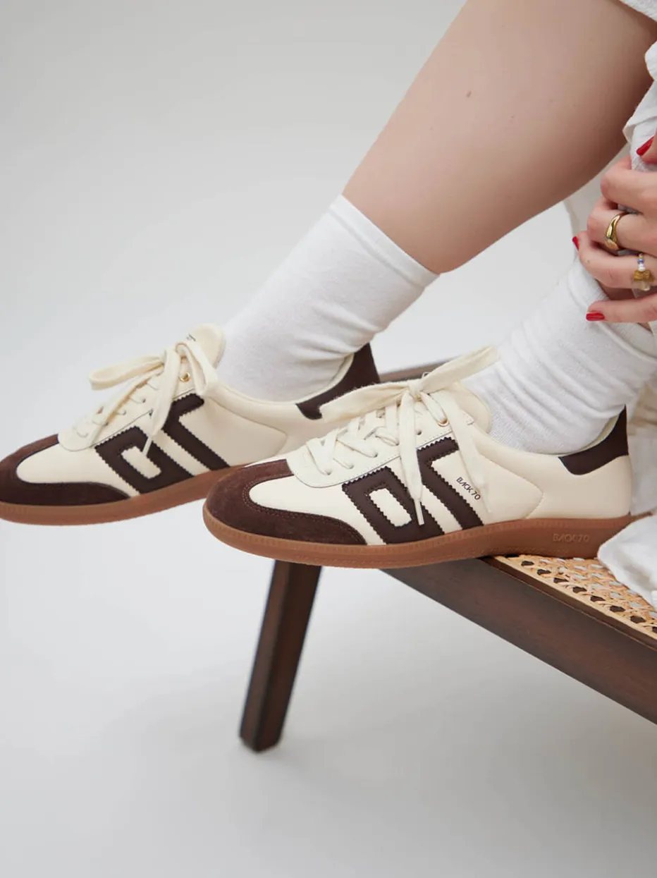 Retro trifft Moderne mit Statement-Finish.Die Marke Back 70 verleiht der Kategorie Sneaker mit diesem Retro-Modell eine nostalgische Note. Für entspannte City-Looks oder urbane Freizeit-Styles bietet der flach geschnittene Unisex-Sneaker ein harmonisches Design. Gefertigt aus weißem Kalbleder und samtigem Veloursleder in Schokobraun sorgt er dank atmungsaktivem Textilfutter und herausnehmbarem Fußbett für ein angenehmes Tragegefühl. Die klassische Schnürung, goldfarbene Ösen und dezente Ton-in-Ton-Nähte unterstreichen das hochwertige Finish. Logo-Elemente im Fersen- und Zungenbereich bringen den typischen 70s-Charakter zur Geltung. Kombiniert zu cremefarbenen Socken oder Canvas-Bags entsteht ein stimmiger Vintage-Look. Ein hochwertiger Eyecatcher mit inspirierter Heritage-Ästhetik.