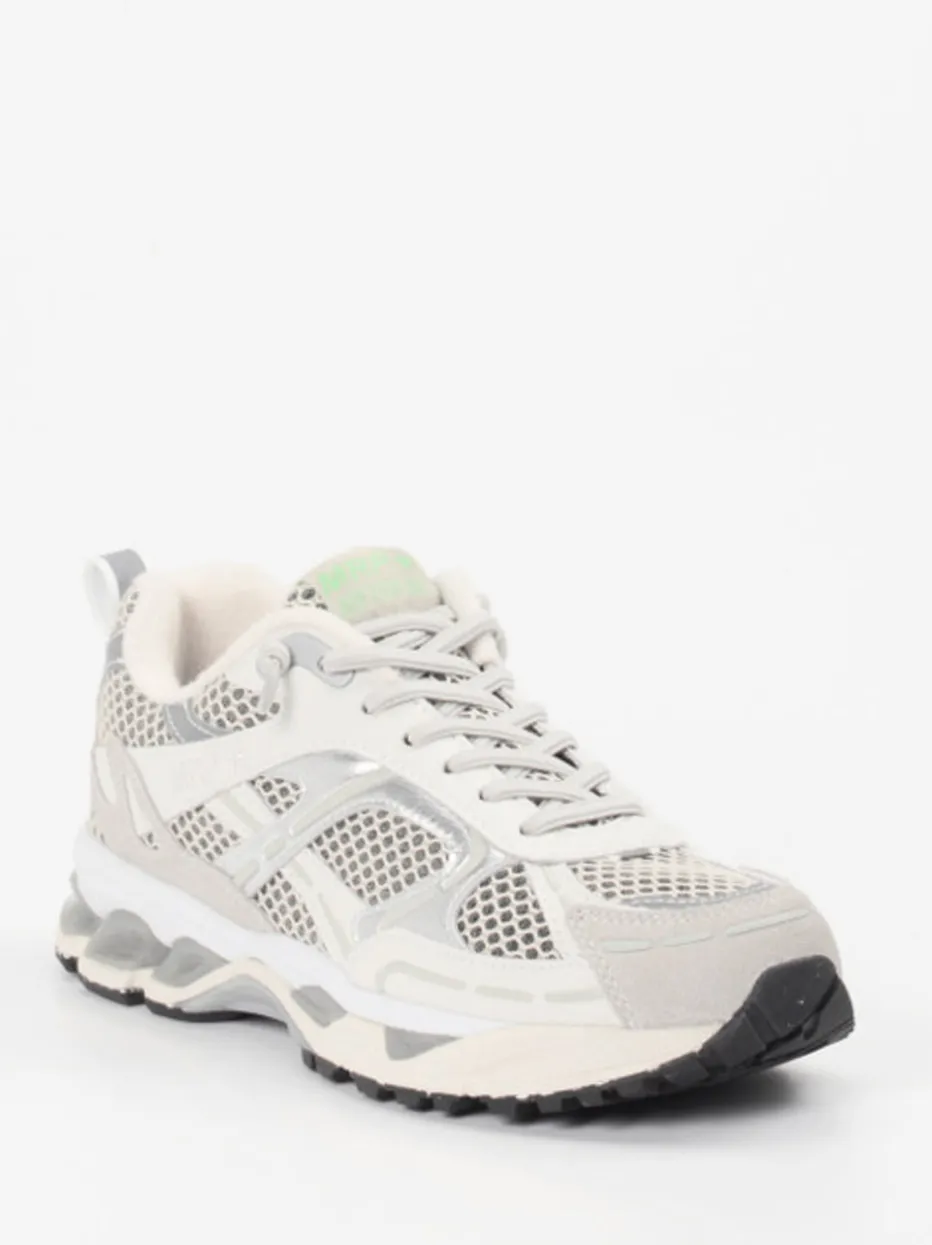Retro-Tech für moderne Streetlooks.MRP bringt mit diesem Retro-Sneaker ein Modell für Damen auf den Markt, das sportlichen Lifestyle mit Trendsicherheit vereint. Ideal für den urbanen Alltag überzeugt das Modell durch seinen Materialmix aus Velour und atmungsaktivem Mesh in matt-texturierter Oberfläche. Silbermetallic-Overlays und reflektierende Details setzen modische Akzente auf dem Offwhite-Grundton. Die dynamisch geformte Silhouette, die markentypisch gepolsterte Zunge mit Branding sowie die Gummisohle mit 3,5 cm Absatzhöhe sorgen für Komfort und Style. Von Streetwear bis Casual athletisch kombinierbar. Ein modernes Statement für trendorientierte Sneaker-Fans mit Sinn für Funktionalität.