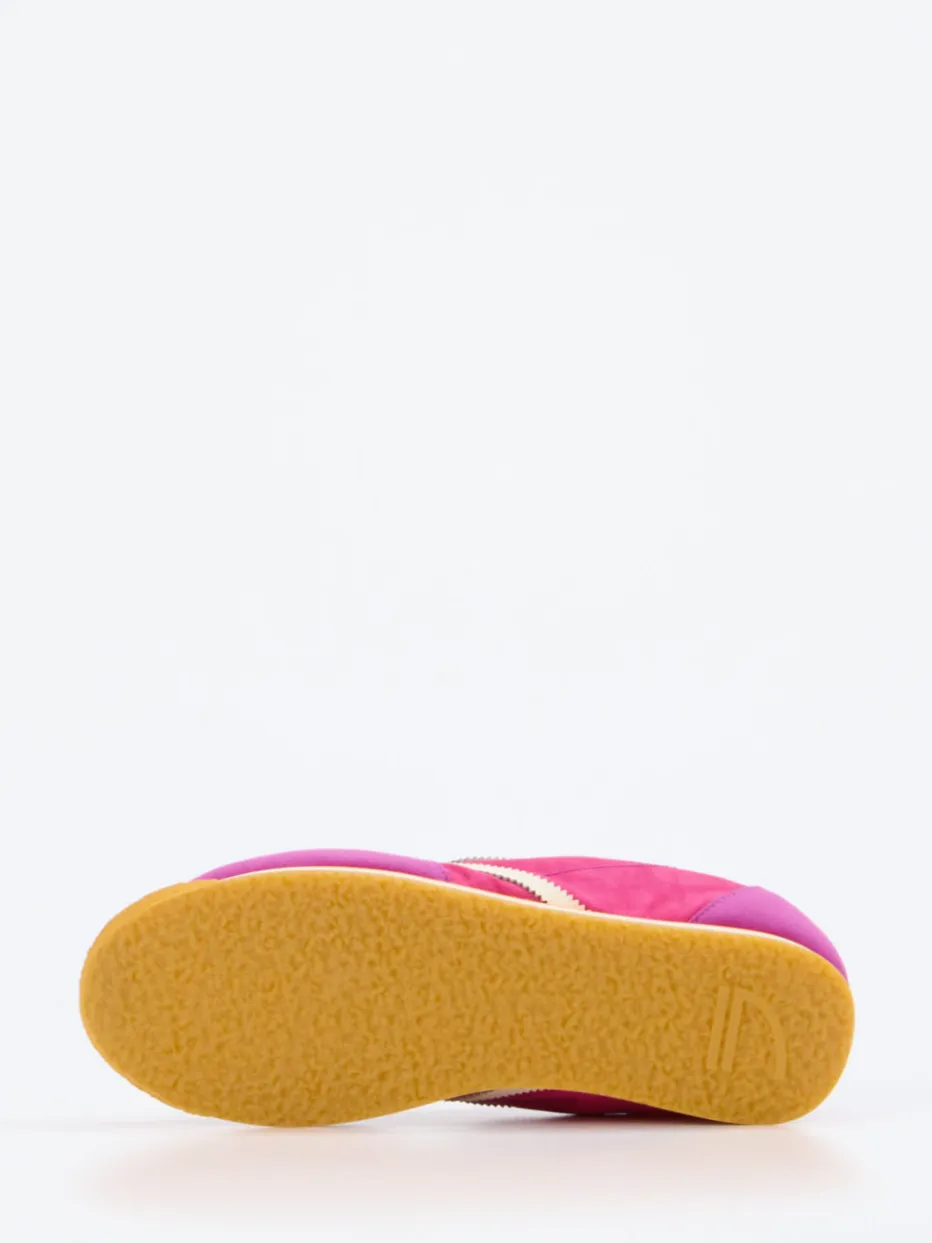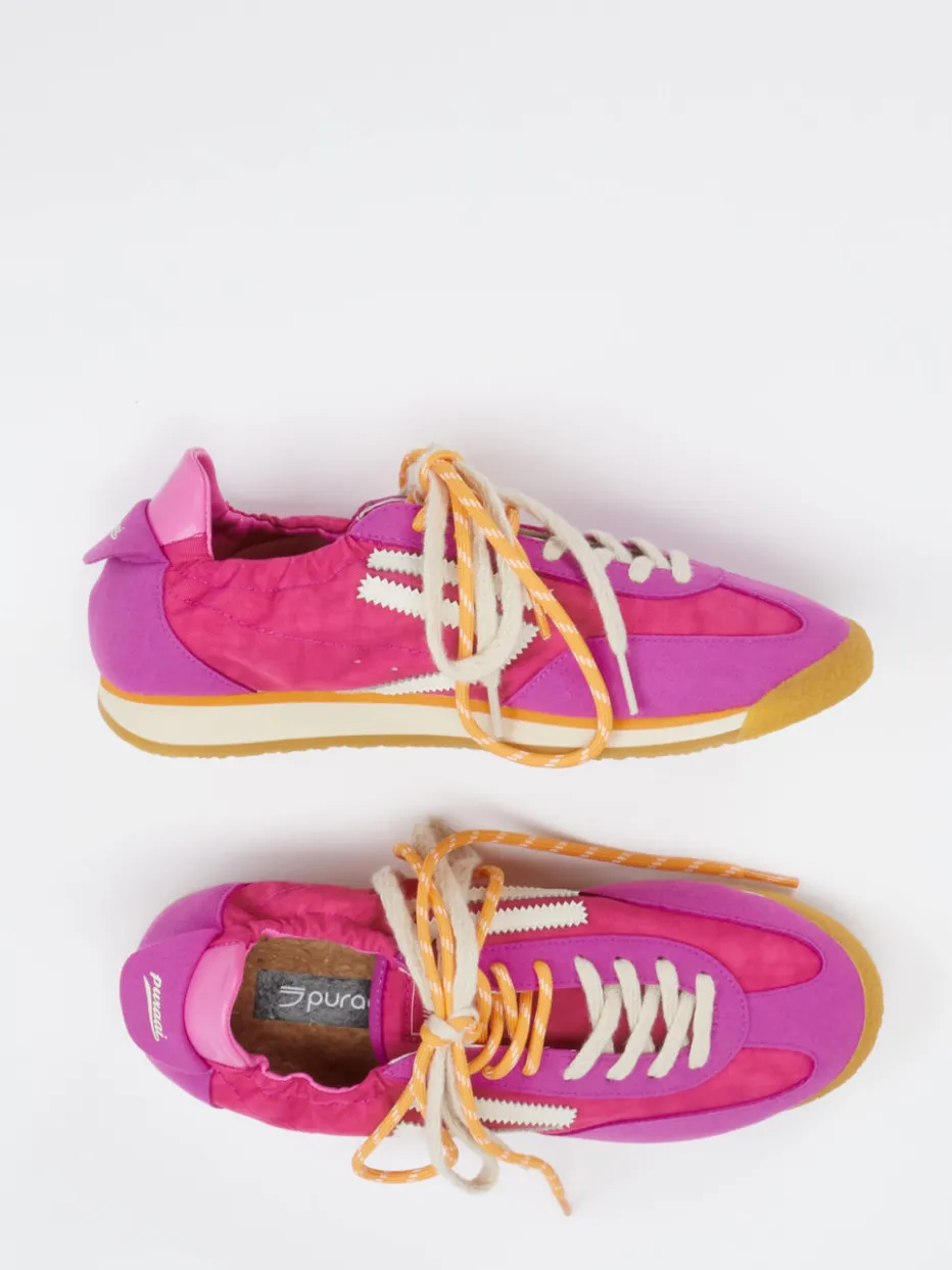 Farbstarker Look mit Vintage-Attitüde. Puraai interpretiert mit diesem Damen-Sneaker das klassische Retro-Runner-Design neu. Ein perfekter Begleiter für urbane Tage mit sportivem Anspruch, vereint das Modell pinkfarbenes Velour und strukturiertes Textil zu einem matten, kontrastreichen Gesamtbild. Die flache, schmale Silhouette setzt Zickzack-Applikationen und zweifarbige Schnürsenkel stilecht in Szene. Eine elastische Fersenlasche und die sichtbare Kork-Innensohle bieten funktionalen Komfort. Als Teil des „Retro-Sneaker Revival“ bringt der Schuh modische Streetwear-Energie ins Spiel. Ein Eyecatcher für trendorientierte Looks mit ausdrucksstarkem Profil.