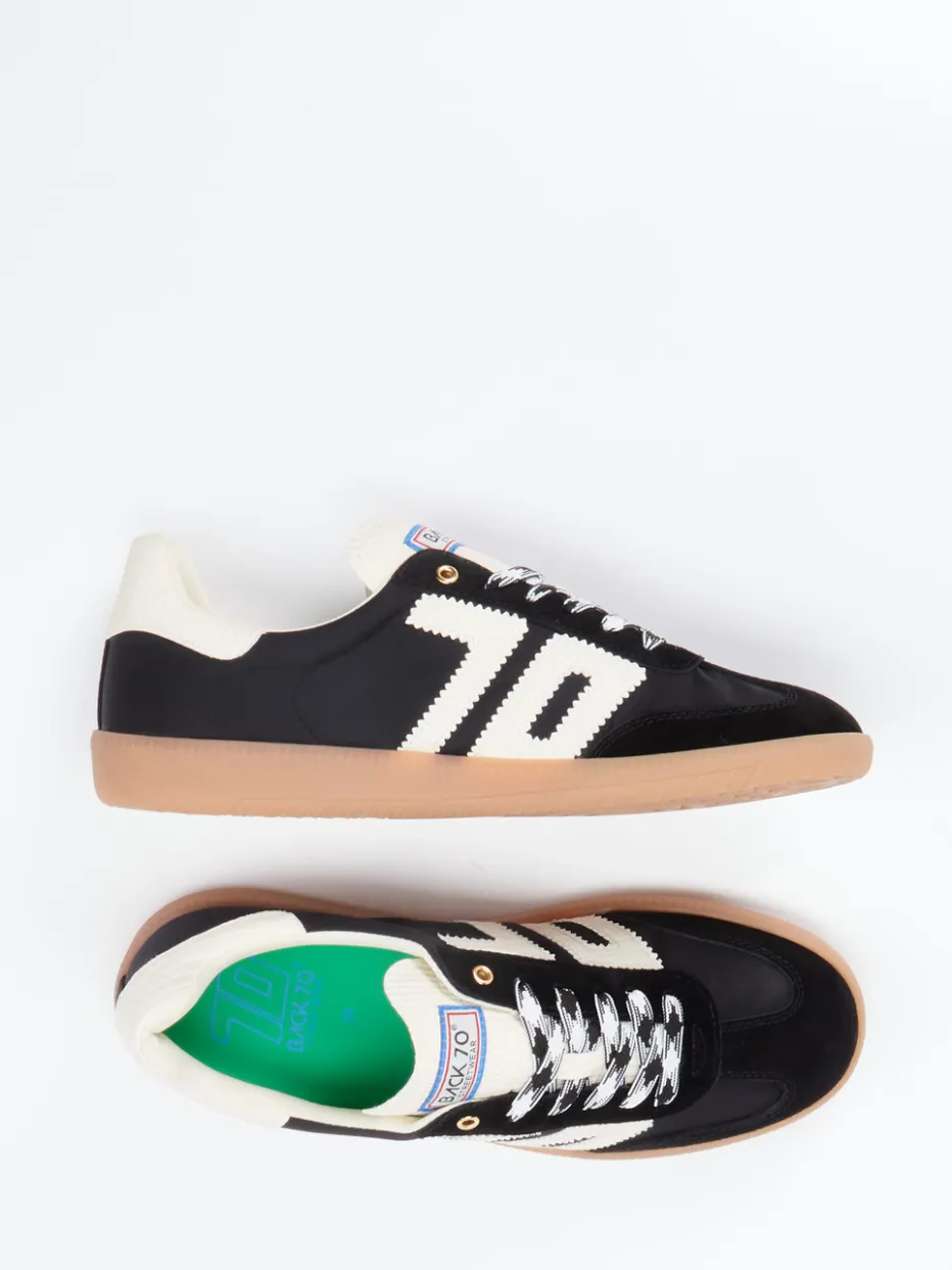 Dieser Sneaker der Marke Back 70 vereint schwarzen Velour und Nylon mit kontrastreichem Streetstyle-Design und einer honigfarbenen Gummisohle. Ideal für trendbewusste Looks mit Retro-Spirit.