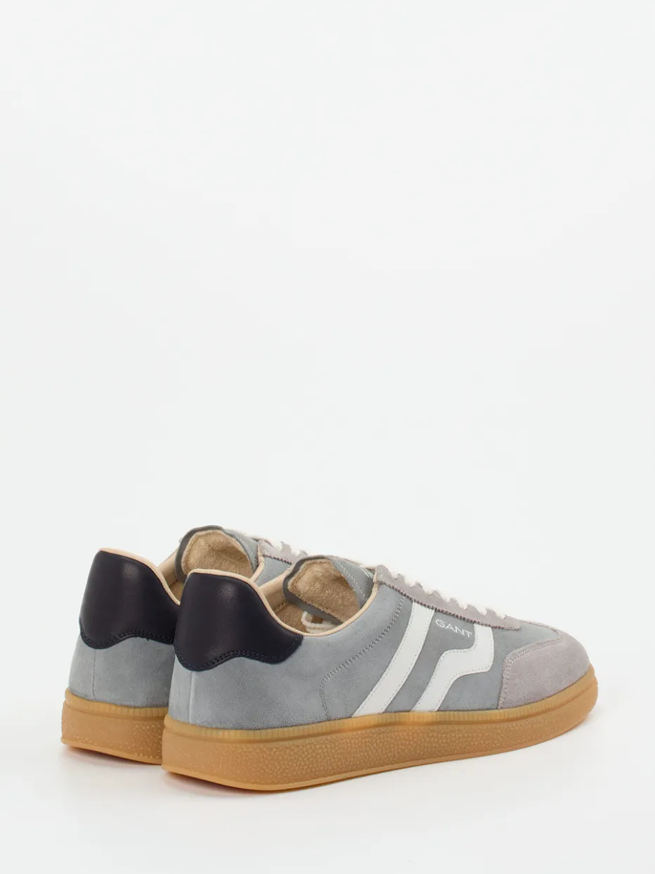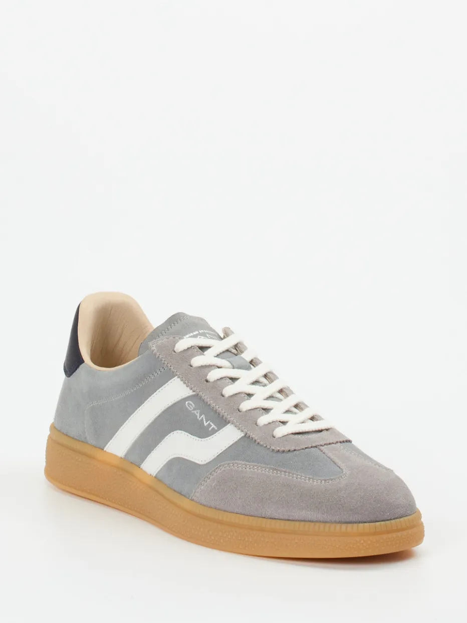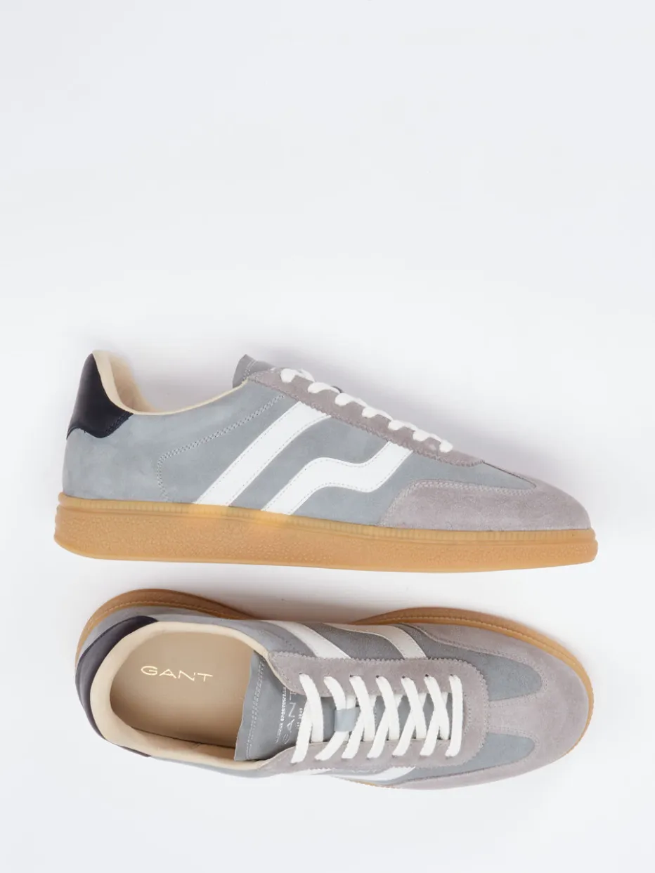Streetstyle mit Vintage-Charme.Der Herren-Sneaker von Gant vereint Retro-Look mit Komfort. Ideal für entspannte City-Tage oder relaxte Wochenend-Pläne überzeugt das Modell mit einem Obermaterial aus samtig angeschliffenem Veloursleder in Graublau. Weiße Kontraststreifen und ein navyblauer Fersenpatch setzen klassische Akzente, ergänzt von filigranen Logo-Prägungen. Die flache Silhouette, Schnürverschluss sowie die flexible honigfarbene Gummisohle mit Profilunterseite bieten Halt und Stil. Inspiriert vom 90s-Streetwear-Look fügt er sich mühelos in casual Outfits mit Jeans oder entspannter Chino ein. Gant kombiniert markentypische Qualität mit authentischem Retro-Appeal.