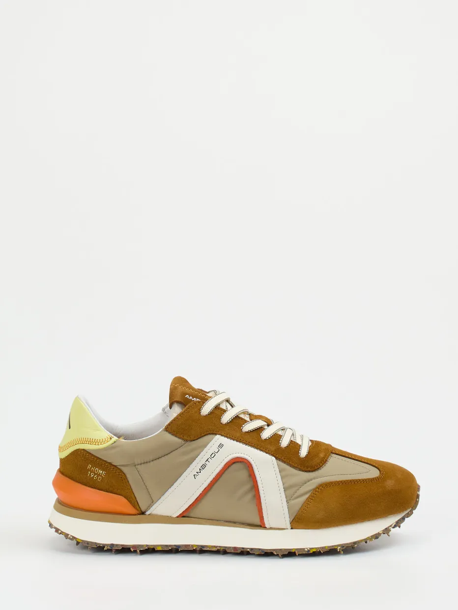Mit seiner Kombination aus cognacfarbenem Veloursleder und taupefarbenem Nylon setzt das Modell auf eine textile Ästhetik mit samtiger Oberfläche. Kontrastdetails in Weiß und Orange verleihen dem klassisch flachen Schnitt eine auffällige Dynamik, während die mehrfarbige Gummisohle mit sichtbaren Recycling-Elementen einen markanten Abschluss bildet. Die profilierte Sohle bietet Halt im Alltag, der gepolsterte Fersenbereich sorgt für Komfort. Inspiriert von 90s-Styles passt der Sneaker perfekt zu urbanen Casual-Looks.