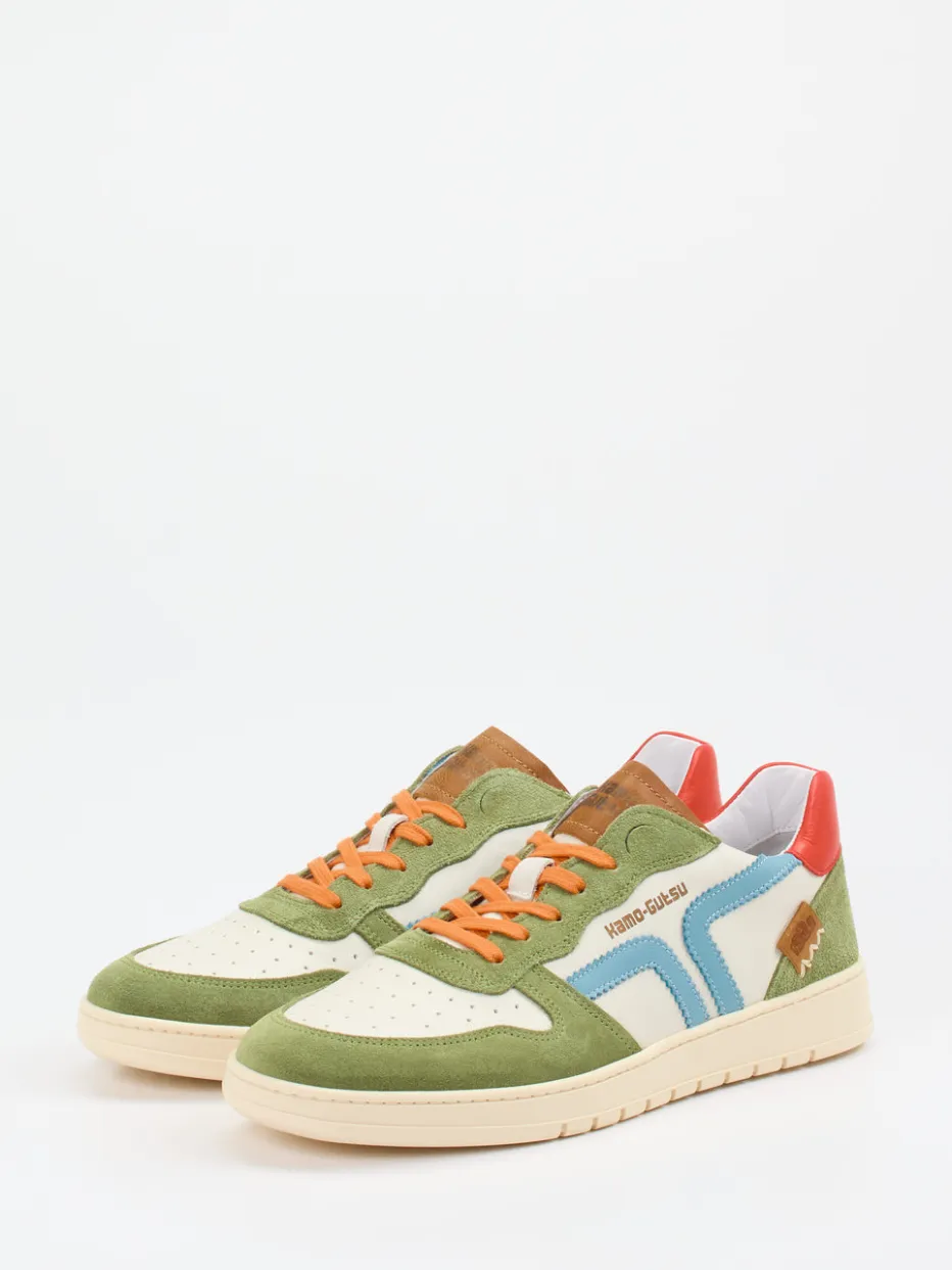 Der Retro-Sneaker von Kamo Gutsu kombiniert perforiertes Kalbleder mit farbintensiven Veloursleder-Overlays und Streetstyle-Flair – ein expressives Highlight für Fashion-Liebhaber.