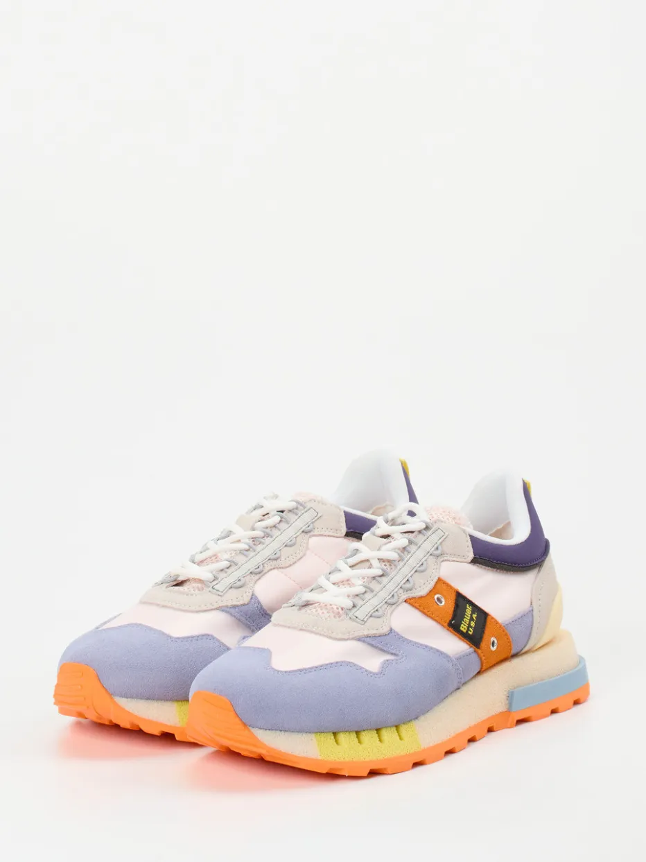 Dieser Retro-Sneaker von Blauer kombiniert Veloursleder mit atmungsaktiven Textilien zu einem kraftvollen Colorblocking-Design in Pastell und Neon. Ideal für stilbewusste Alltagslooks mit Streetwear-Attitüde.