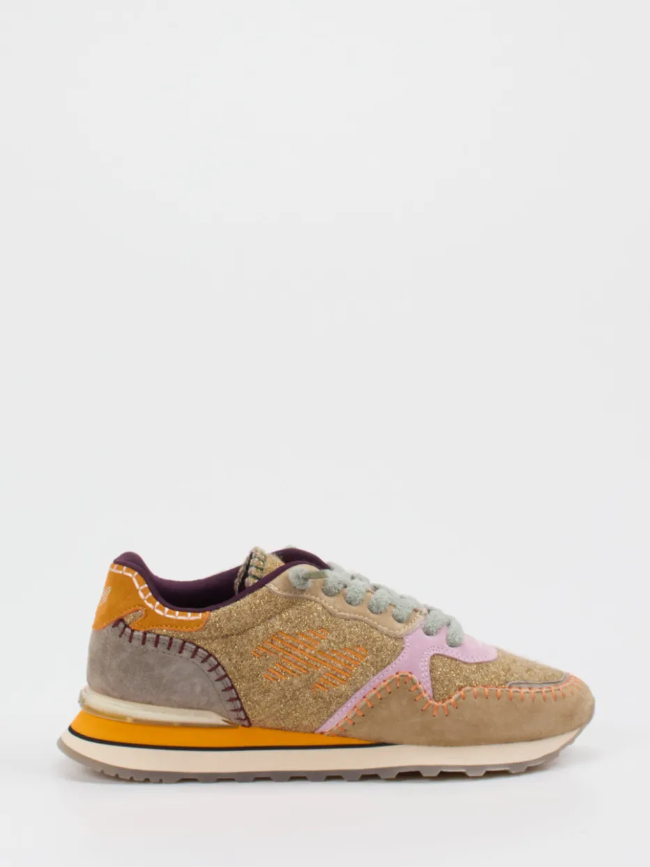 Anders als erwartet – im besten Sinne.MRP zeigt mit diesem Damen-Sneaker aus der Retro-Runner-Kategorie ein Modell, das moderne Farbnuancen mit ikonischem Glanz vereint. Für urbane Spaziergänge oder den Städtetrip kombiniert dieser Sneaker weiches Veloursleder mit glitzerndem Textil, ergänzt durch strukturierte Glattleder-Details. Das multi-farbene Design besticht durch Sandbeige in Kombination mit Akzenten in Flieder und Lachsorange sowie auffälligen Kontrastnähten. Die klassische, rund zulaufende Silhouette sitzt auf einer profilierten Gummisohle mit 3 cm Absatzhöhe und 1,5 cm Plateau. Ein gesticktes Logo und farblich abgestimmte Einsätze setzen zusätzliche Highlights. Y2K-Elemente und Color-Blocking machen ihn mustergültig für trendorientierte Styles. Ein MRP-Design mit Ausdruckskraft für selbstbewusste Alltagslooks.