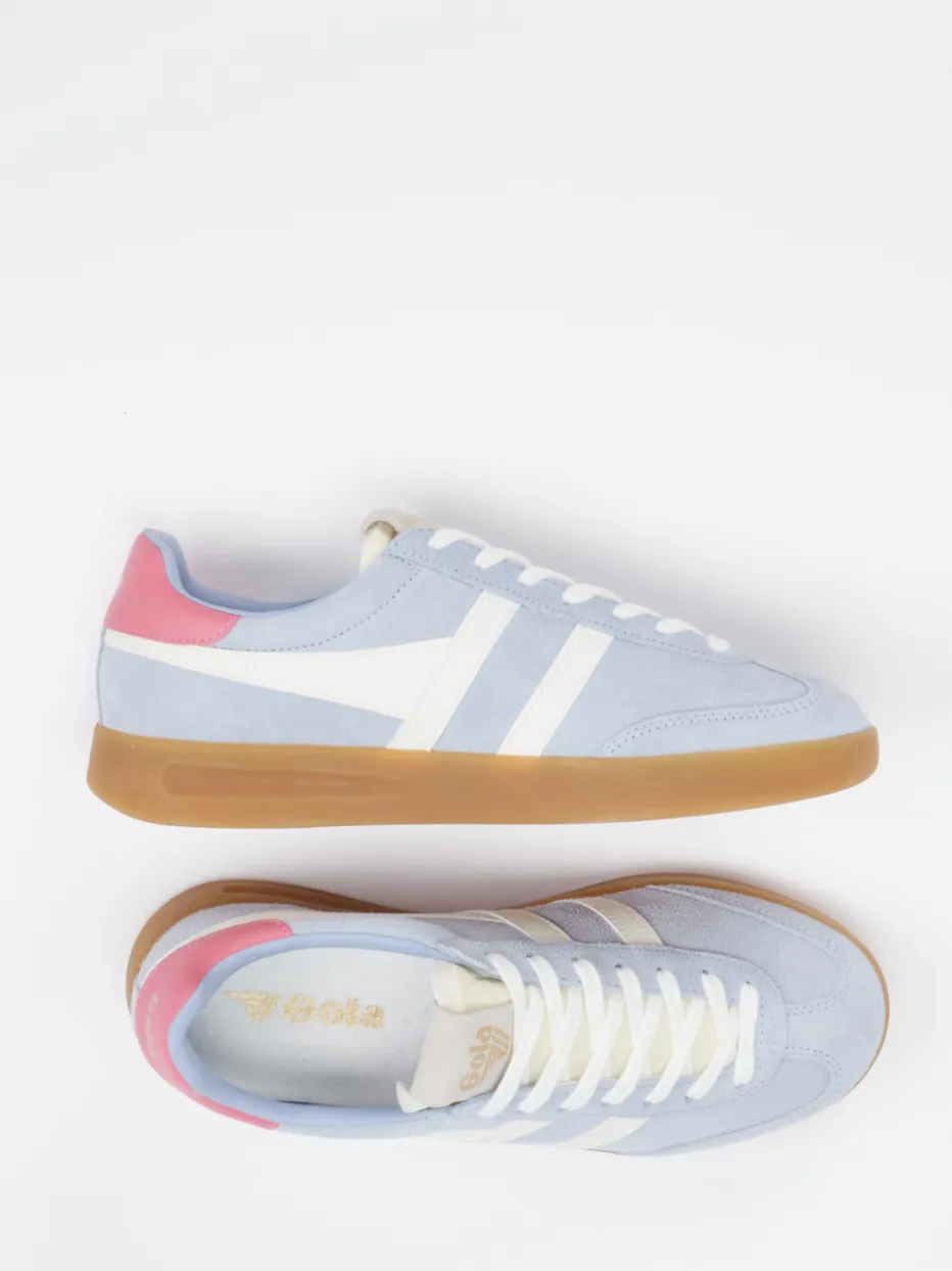 Der Retro-Sneaker von Gola bringt frische Leichtigkeit in die Sneaker-Kollektion. Ideal für entspannte Alltagsmomente verbindet das Modell softes Veloursleder mit einer angenehm texturierten Oberfläche. Die Farbgebung in Hellblau mit altrosa Akzenten und cremeweißen Kontraststreifen unterstreicht das Vintage-Flair. Ein goldfarbener Logoprint sowie die klassische flache Silhouette mit Schnürverschluss runden das Design stilvoll ab. Die Gummisohle mit rutschhemmendem Profil sorgt für Komfort bei urbanen Aktivitäten. Im Streetwear inspirierten Stil passt der Schuh perfekt zu lässigen Denim-Looks oder pastellfarbenen Socken. Ein modischer Alltagsbegleiter mit authentischem 90er-Spirit aus dem Hause Gola.