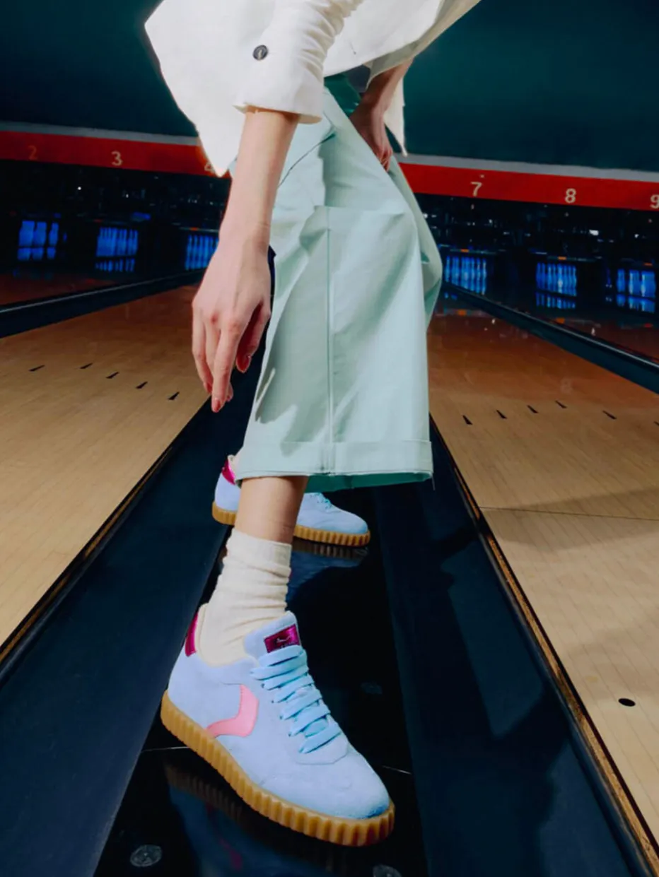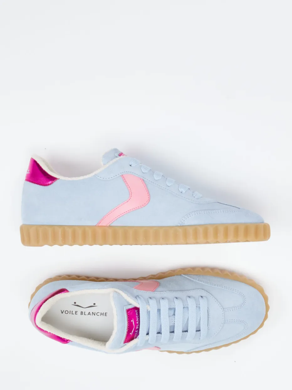Der hellblaue Retro-Sneaker von Voile Blanche kombiniert samtig weiches Veloursleder mit Metallic-Details: perfekt für trendige Freizeitlooks mit Charakter.
